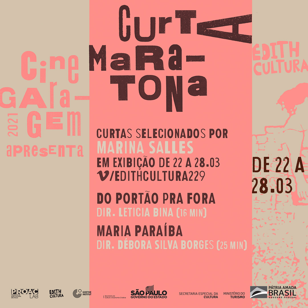 A mostra Curta Maratona, extensão do Cine Garagem em versão on-line, realizada pelo Edith Cultura, continua, desta vez, com a exibição dos curtas “Maria Paraíba” (Dir. Débora Silva Borges) e “Do Portão Pra Fora” (Dir. Letícia Bina), selecionados por Marina Salles. Os filmes ficarão disponíveis no canal do Vimeo do Edith Cultura, no link: https://vimeo.com/showcase/8277780, […]