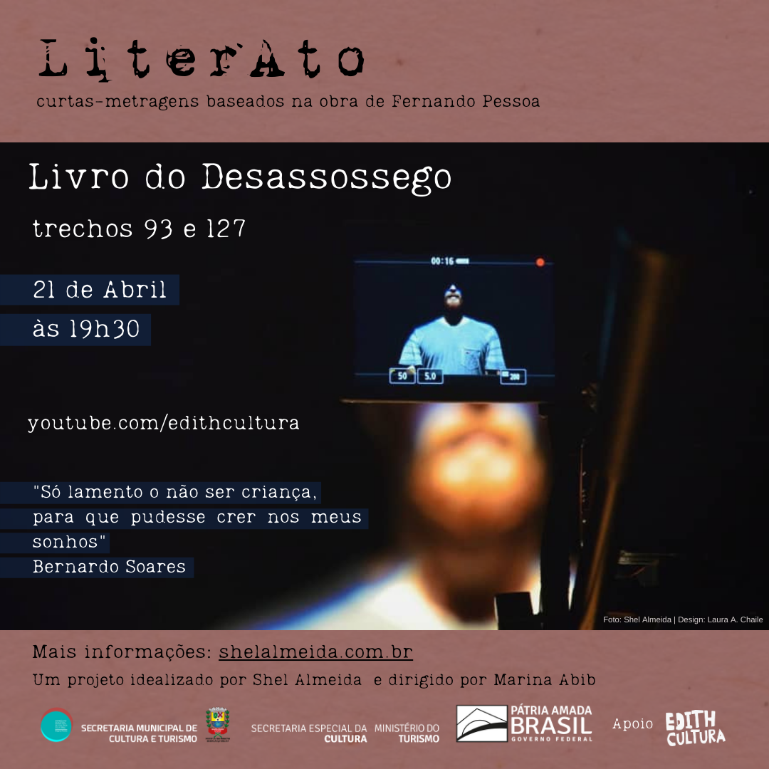 A série de curtas-metragens LiterAto, projeto que tem como base a obra dos heterônimos do poeta português Fernando Pessoa, apresenta, na próxima quarta-feira, 21, o filme baseado nos trechos 93 e 127 do Livro do Desassossego, de Bernardo Soares. A exibição acontece às 19h30 pelo YouTube do Edith Cultura. No mesmo canal, é possível assistir […]