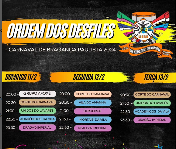 EVENTO DEFINIDA A ORDEM DOS DESFILES PARA O CARNAVAL DE BRAGANÇA 2024 No último domingo, 3, a Liga Independente das Escolas de Samba de Bragança Paulista (Liesb), comandada pelo presidente Cléber Centini, realizou, na quadra da Escola de Samba Acadêmicos da Vila, o sorteio que definiu a ordem dos desfiles das escolas do grupo especial, […]