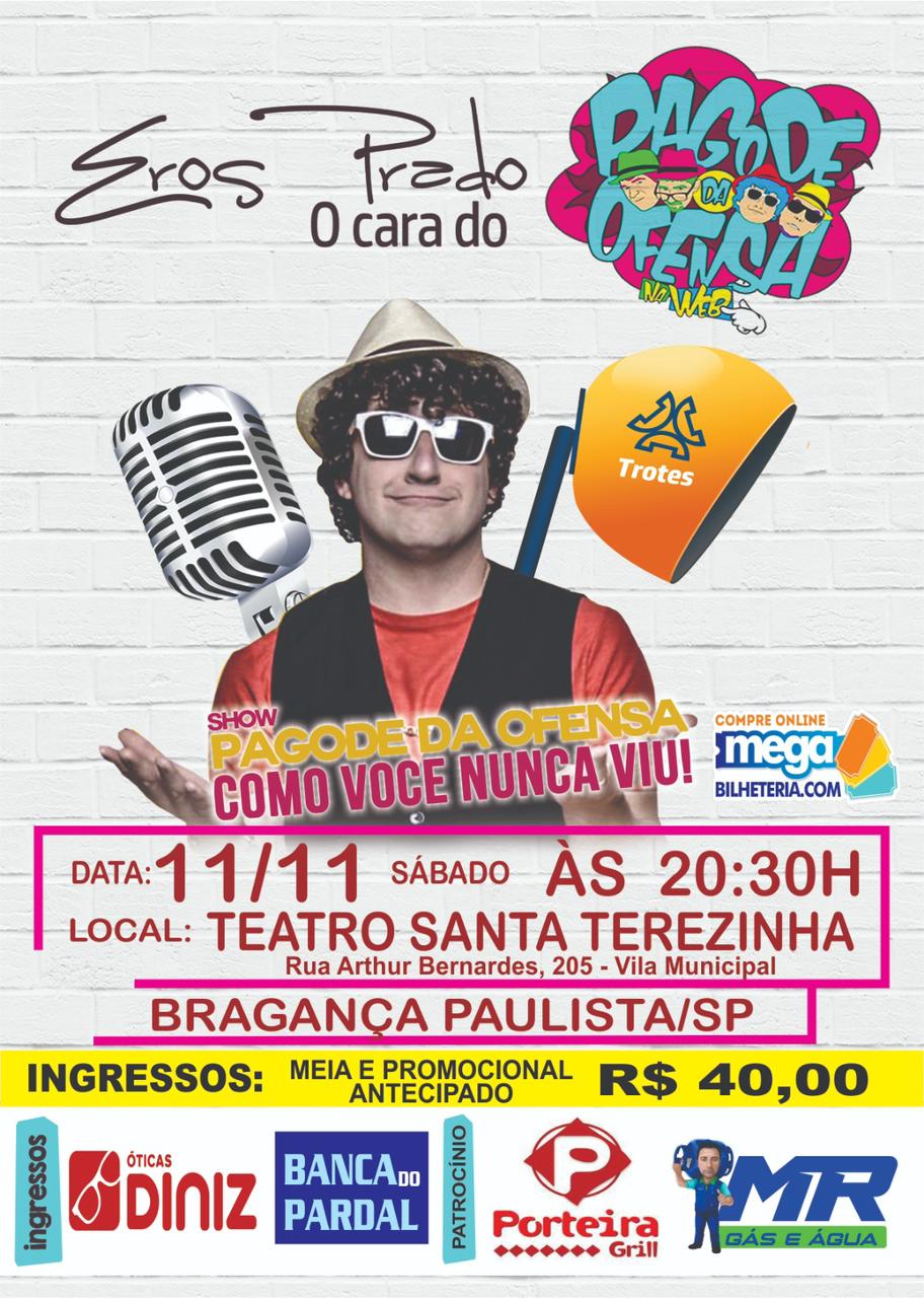 O Teatro Santa Terezinha, localizado na Rua Bernardo Stefani, 100, na Vila Municipal, receberá neste sábado, 11, às 20h30, o espetáculo de humor “Pagode da Ofensa” com um dos maiores humoristas do Brasil, Eros Prado. Esta será a única apresentação artista em Bragança. Os ingressos estão à venda na Banca do Parda, Óticas Diniz e […]