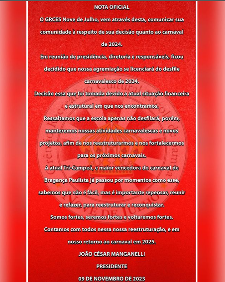 Nesta quinta-feira, 9 de novembro, o presidente da Grêmio Recreativo e Cultural Escola de Samba Nove de Julho, João César Manganelli, conhecido como Cesinha, anunciou que a agremiação irá se licenciar do desfile carnavalesco de 2024. A nota divulgada nas redes sociais da escola esclarece que essa decisão foi tomada devido à atual situação financeira […]
