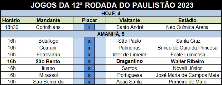 Neste final de semana, termina a primeira fase (grupos) do Campeonato Paulista. No total, serão oito partidas, sendo que apenas uma está marcada para hoje à noite, entre Corinthians e Santo André. Os outros sete jogos acontecem neste domingo, 5, todos marcados para o mesmo horário, às 16h, incluindo o confronto entre Red Bull Bragantino […]