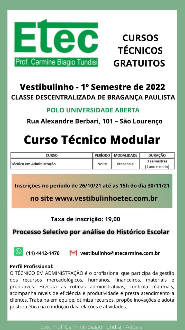 As inscrições vão até o dia 30 de novembro Estão abertas as inscrições para o curso Técnico em Administração da Etec “Prof Carmine Biagio Tundisi”. O curso é gratuito e as aulas acontecerão no período noturno, no Polo Universidade Aberta, localizado na Rua Alexandre Berbari, 101, no Jardim São Lourenço. Para os interessados em participar […]