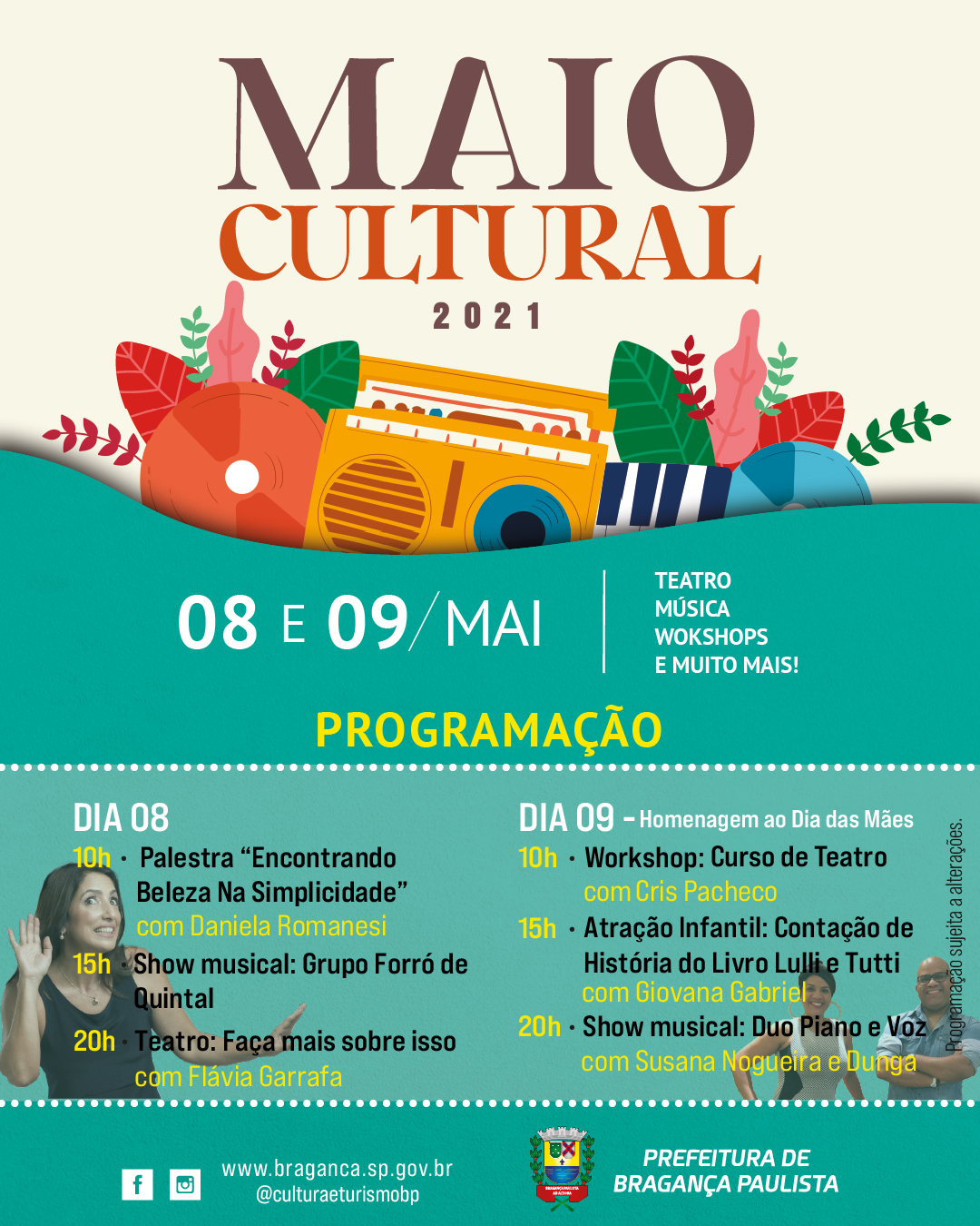 Em versão on-line, o Maio Cultural 2021 começa neste sábado, 8. Segundo a Secretaria de Cultura, as apresentações acontecerão durante todos os finais de semana do mês em três horários: às 10h, às 15h e às 20h, pelo Facebook da Prefeitura de Bragança Paulista, pelo link: https://www.facebook.com/prefeitura debragancapaulista. A abertura oficial do evento acontece hoje, […]