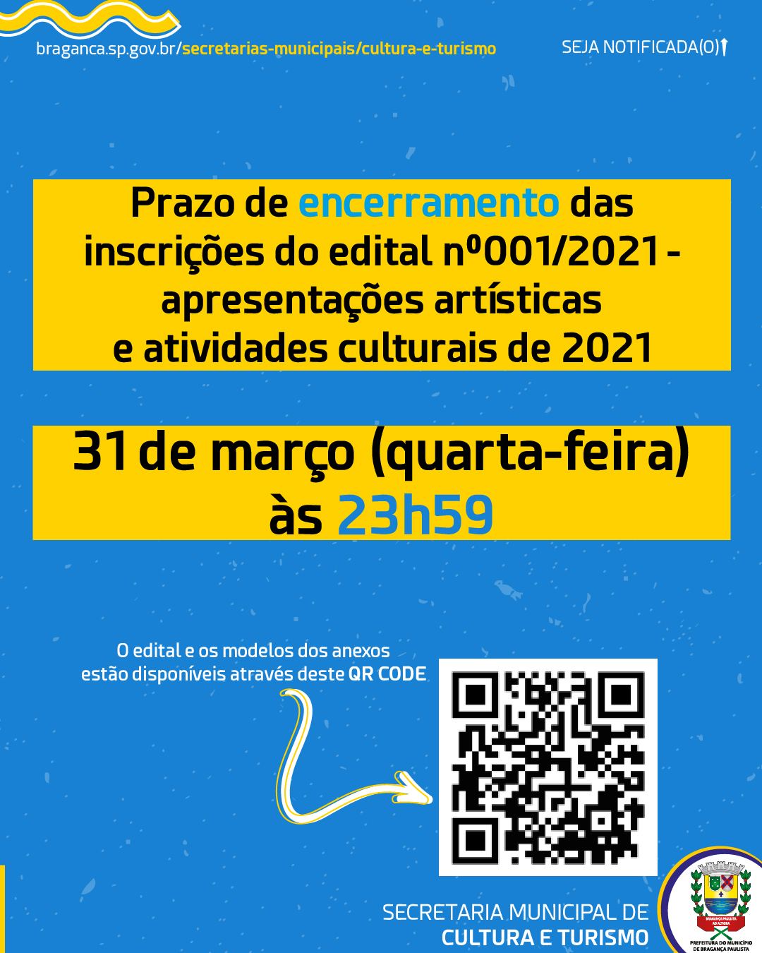 A Secretaria de Cultura e Turismo recebe até esta quarta, 31, as propostas para o Chamamento Público nº001/2021. A ação visa cadastrar projetos de interessados em apresentar e desenvolver atividades culturais para compor a programação do município. Para participar, o proponente deve ser maior de 18 anos, pessoa física ou pessoas jurídicas de direito privado, que […]