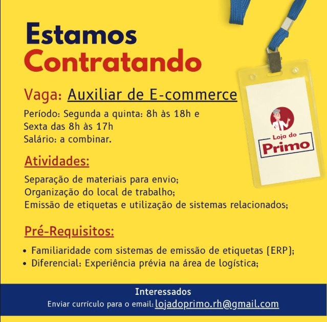 A Loja Primo em Bragança Paulista está com oportunidade de trabalho! Atividades: – Separação de materiais para envio – Organização do local de trabalho – Emissão de etiquetas e uso de sistemas relacionados Pré-requisitos: – Familiaridade com sistemas de emissão de etiquetas (ERP) – Diferencial: Experiência anterior na área de logística Horário: Segunda a quinta: […]