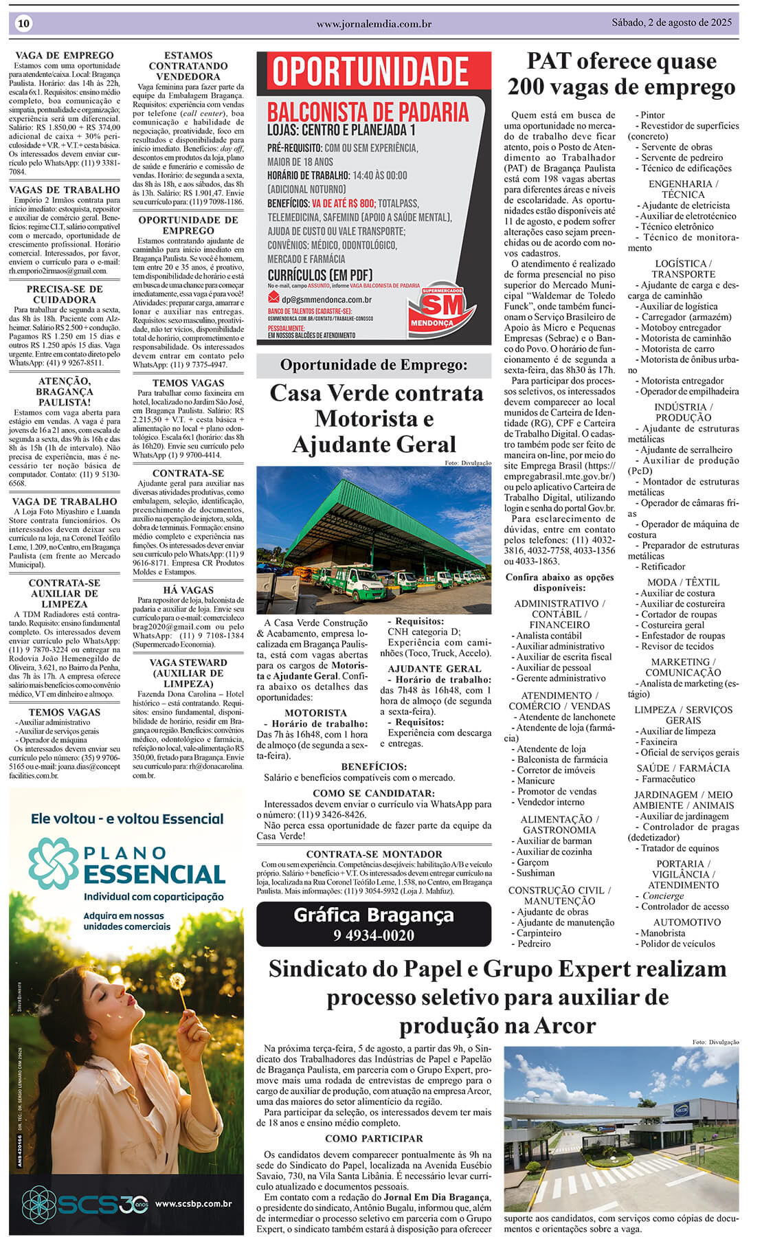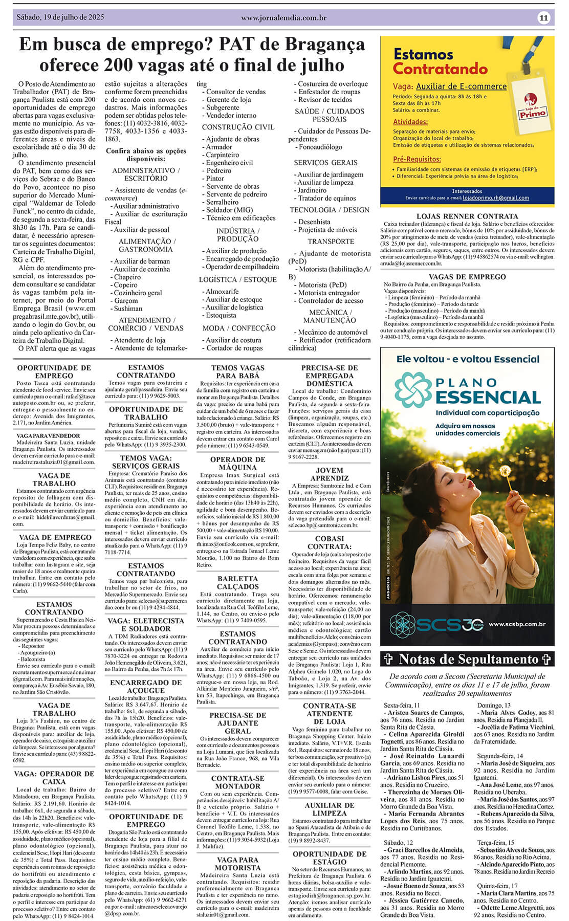 O Posto de Atendimento ao Trabalhador (PAT) de Bragança Paulista está com 200 oportunidades de emprego abertas para vagas exclusivamente no município. As chances estão disponíveis para diferentes áreas e níveis de escolaridade, e o atendimento ao público segue até o dia 30 de julho. O PAT funciona no piso superior do Mercado Municipal Waldemar […]
