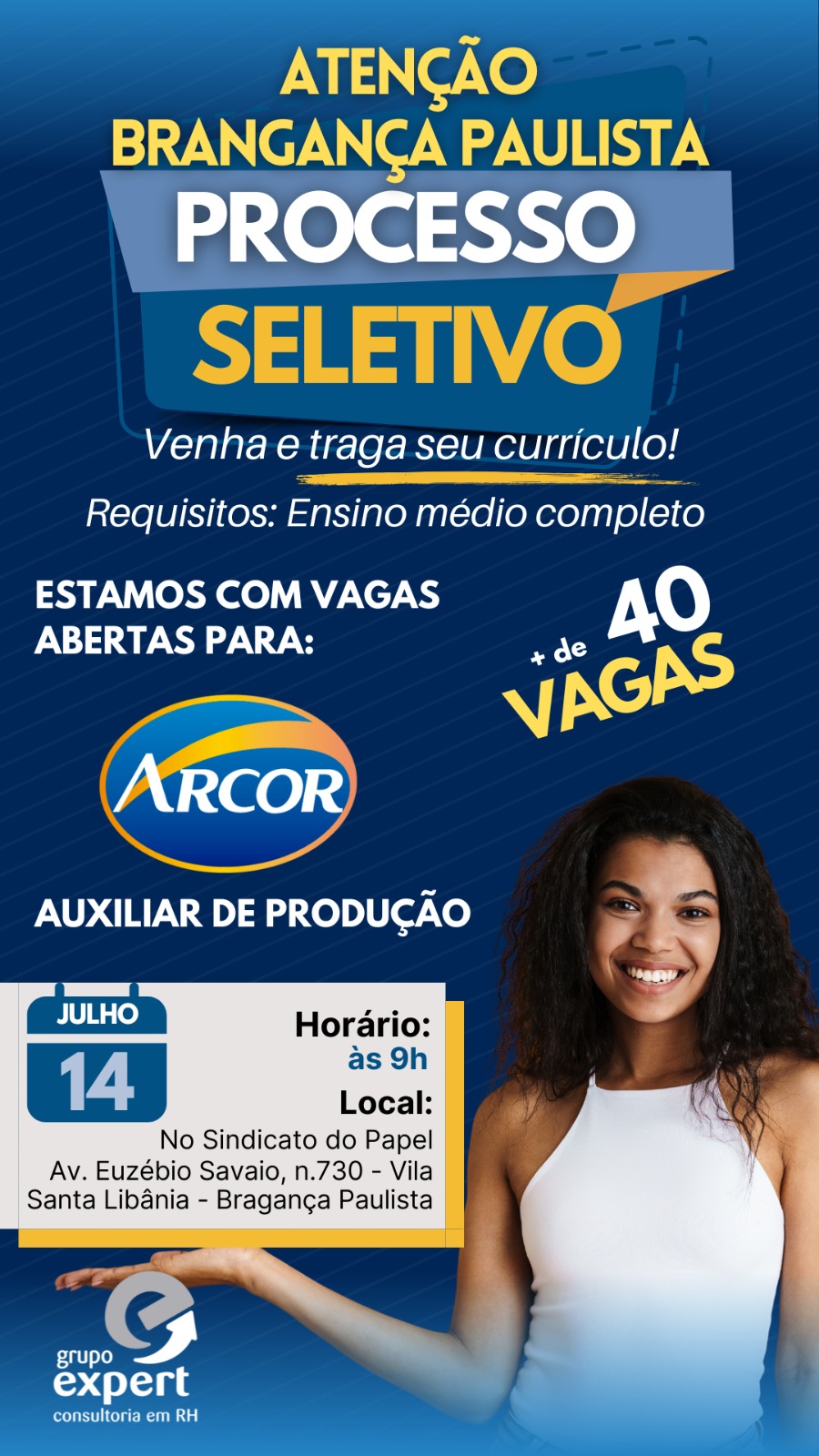 Na próxima segunda-feira, 7 de julho, a partir das 9h, o Sindicato dos Trabalhadores nas Indústrias de Papel, Papelão de Bragança Paulista promove mais uma edição do projeto “Balcão de Empregos”, desta vez em parceria com o Grupo Expert Bragança. A iniciativa visa o preenchimento de diversas vagas para o cargo de Auxiliar de Produção, […]