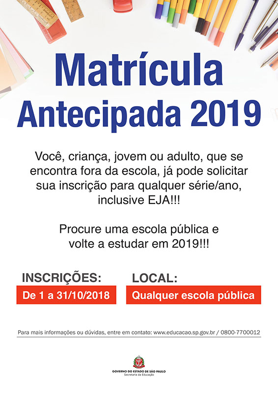 A Secretaria Municipal de Educação, dando sequência ao Programa de Matrícula Antecipada/ Chamada Escolar – Ano 2019, divulgou o período de inscrições para alunos fora da rede pública municipal. A partir dessa segunda-feira, 1º, ao dia 30 de outubro de 2018, começaram a ser aceitas as matrículas para o ensino fundamental 2019. Nesta fase, serão […]
