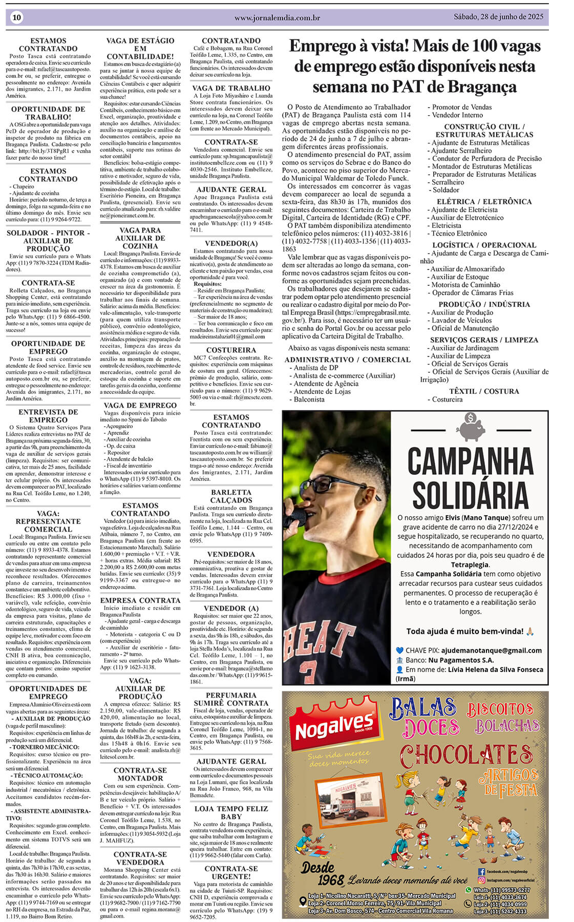 O Posto de Atendimento ao Trabalhador (PAT) de Bragança Paulista divulgou, nesta semana, a disponibilidade de 68 vagas de emprego para diversas áreas no município. As oportunidades estão abertas entre os dias 2 e 8 de julho, podendo sofrer alterações conforme novos cadastros e preenchimento das vagas. O atendimento presencial é realizado no piso superior […]