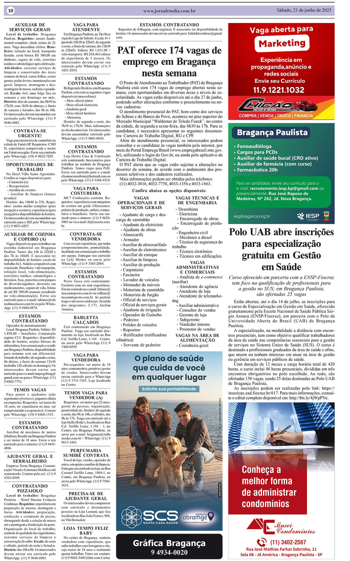 O Posto de Atendimento ao Trabalhador (PAT) de Bragança Paulista está com 174 vagas de emprego abertas nesta semana, com oportunidades em diversas áreas e níveis de escolaridade. As vagas estão disponíveis até o dia 27 de junho, podendo sofrer alterações conforme o preenchimento ou novos cadastros. O atendimento presencial do PAT, assim como dos […]