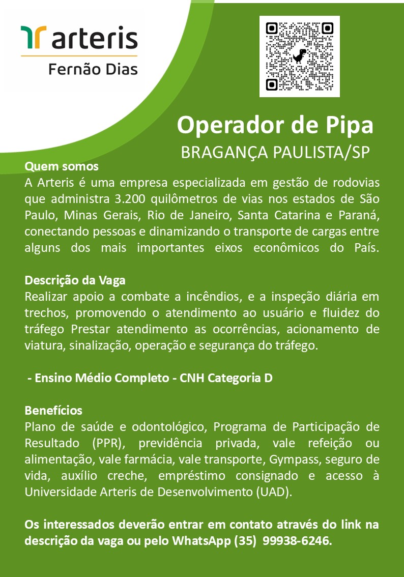 A Arteris, uma das maiores empresas de concessão de rodovias do país, está com vaga aberta para Operador de Pipa, para trabalhar em Bragança Paulista-SP. Com mais de 3.200 km de rodovias administradas em cinco estados brasileiros, a Arteris conecta pessoas e movimenta a economia nacional com segurança e eficiência. ATIVIDADES: – Apoio no combate […]