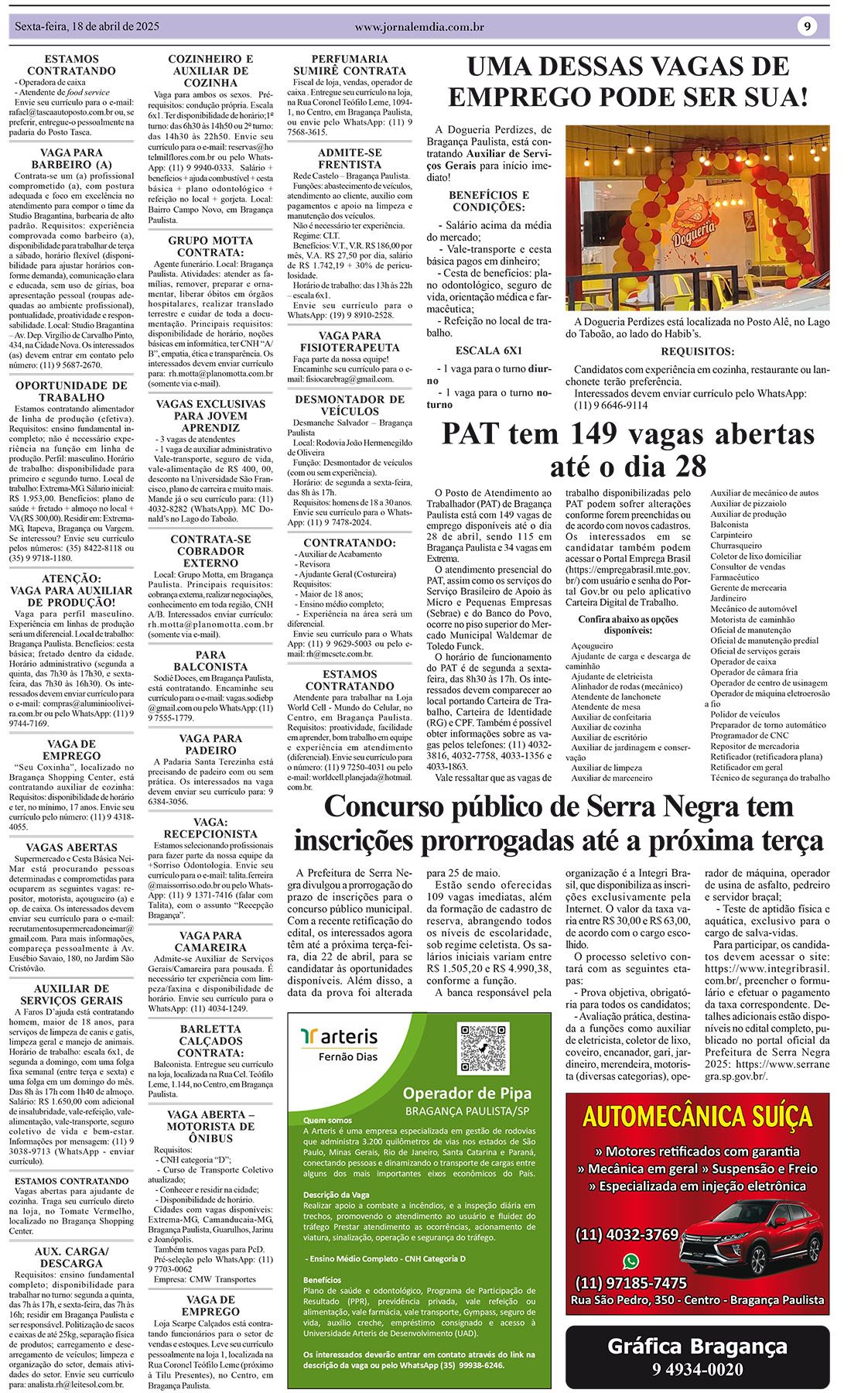 O Posto de Atendimento ao Trabalhador (PAT) de Bragança Paulista divulgou 250 oportunidades de emprego disponíveis na cidade e região. As vagas estão abertas para cadastro entre os dias 9 e 18 de abril. O atendimento presencial é realizado no piso superior do Mercado Municipal Waldemar de Toledo Funck, onde também funcionam o Serviço Brasileiro […]