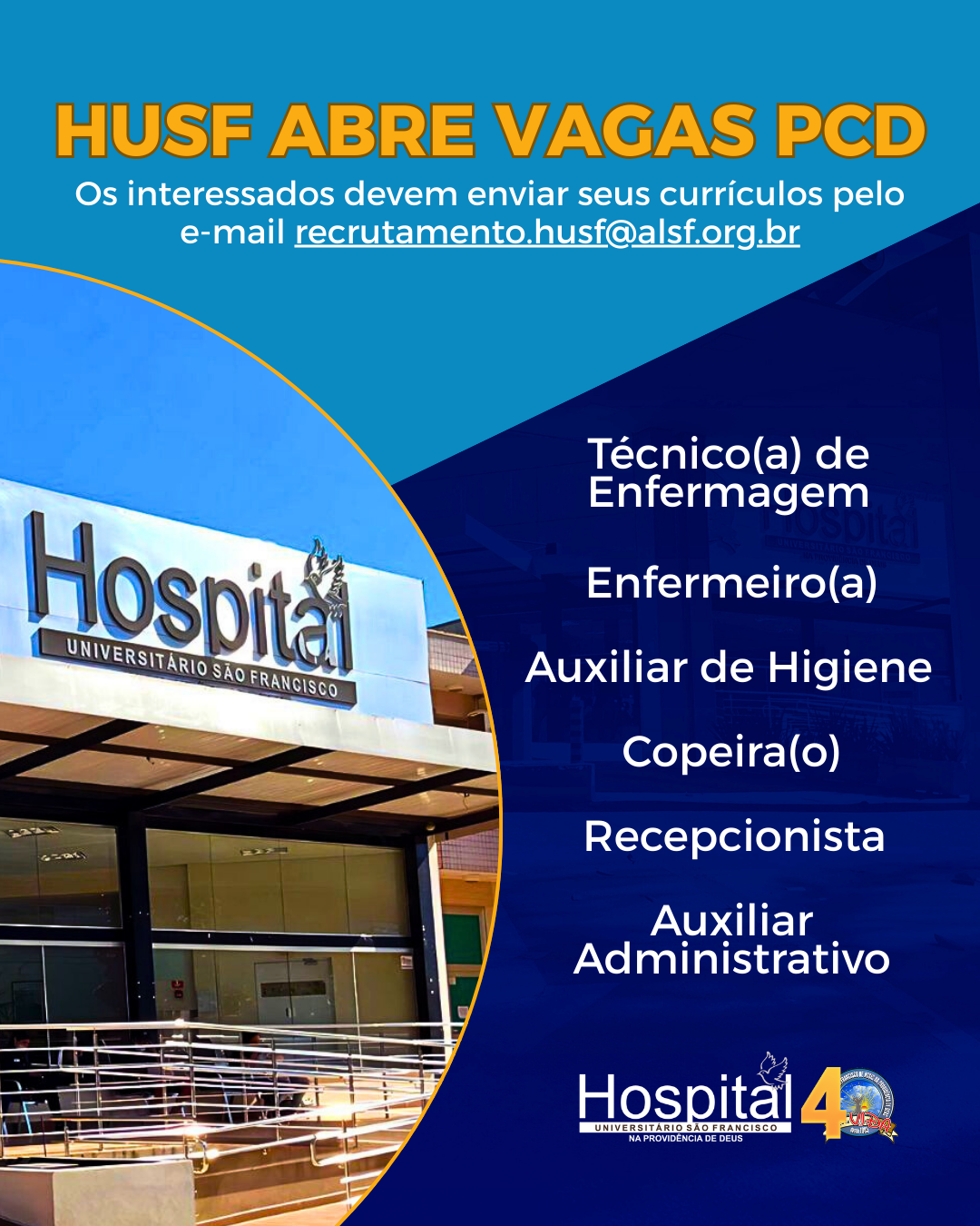 A abertura de vagas reforça o compromisso do HUSF com a inclusão de colaboradores no corpo de funcionários, bem como representa oportunidades profissionais para os candidatos. O Hospital Universitário São Francisco na Providência de Deus (HUSF) está com vagas abertas para Pessoas com Deficiência (PcD) e reabilitados do INSS nos seguintes cargos: técnico(a) de enfermagem, […]