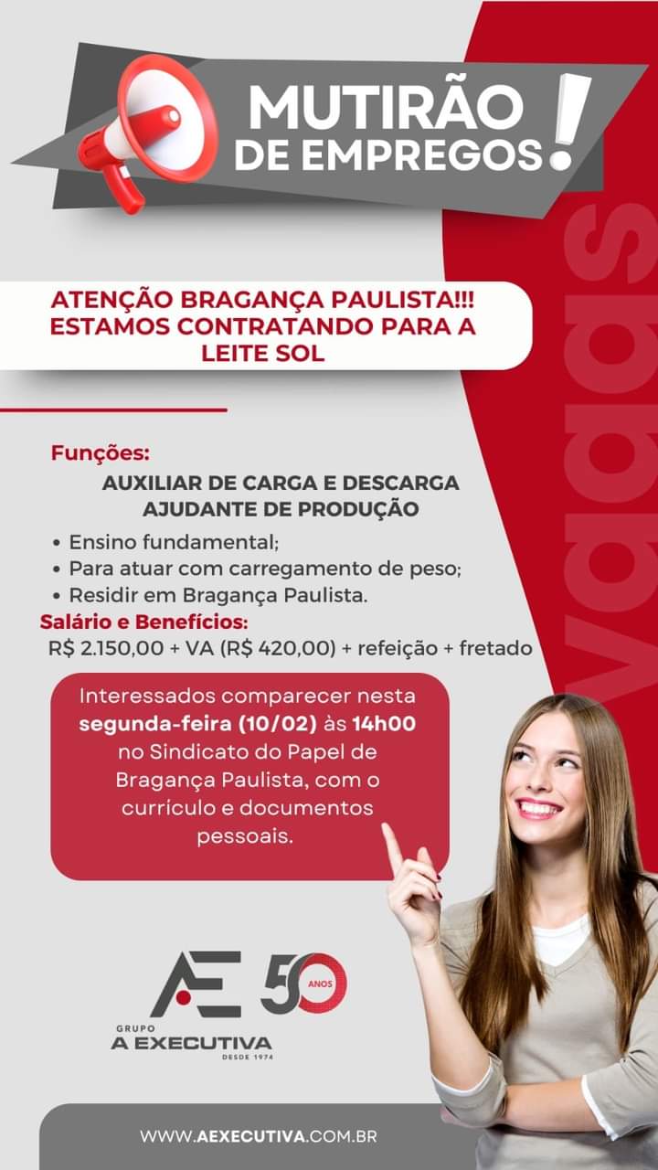 O Sindicato dos Trabalhadores na Indústria de Papel de Bragança Paulista, por meio do seu projeto “Balcão de Empregos”, abrirá mais uma rodada de entrevistas de emprego nesta segunda-feira, 10 de fevereiro. O Grupo A Executiva será responsável pelo Processo Seletivo, que vai ocorrer na parte da tarde, a partir das 14h, na sede do […]