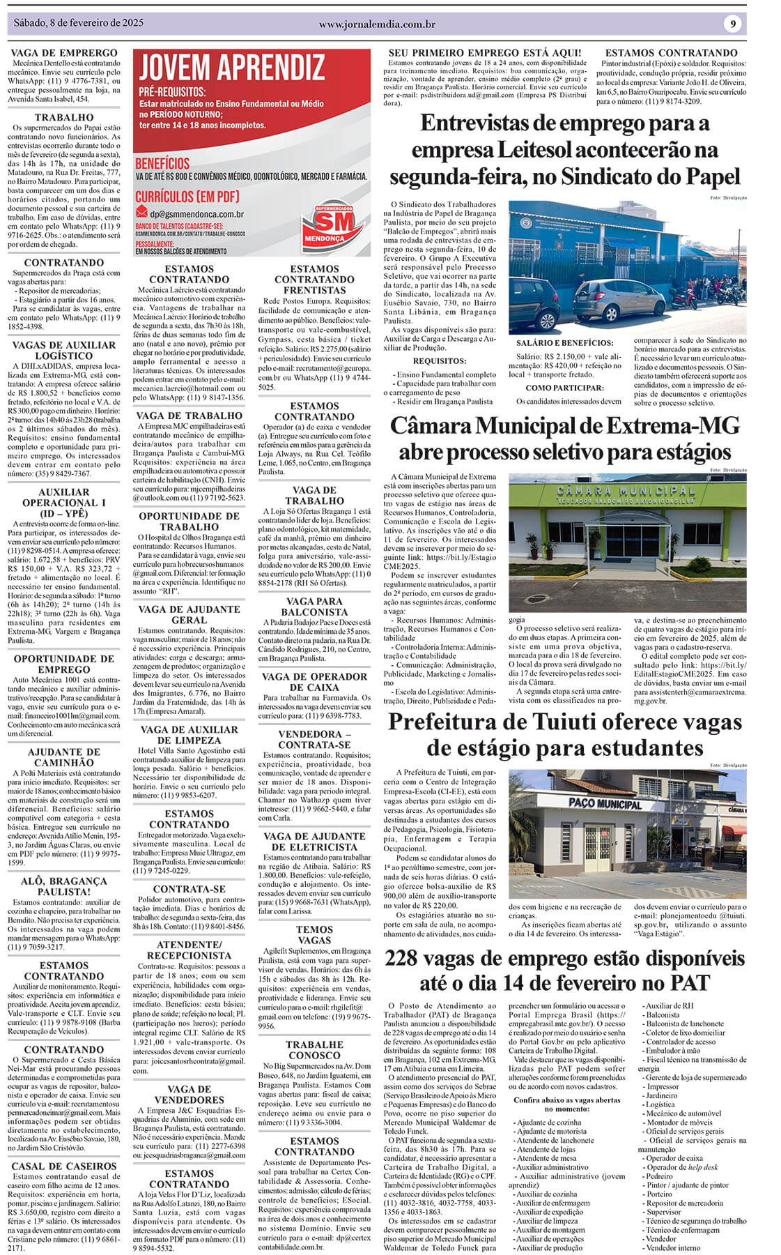 O Posto de Atendimento ao Trabalhador (PAT) de Bragança Paulista anunciou a disponibilidade de 228 vagas de emprego entre os dias 5 e 14 de fevereiro. As oportunidades estão distribuídas da seguinte forma: 108 em Bragança Paulista, 102 em Extrema-MG, 17 em Atibaia e 1 em Limeira. O atendimento presencial do PAT, assim como dos […]