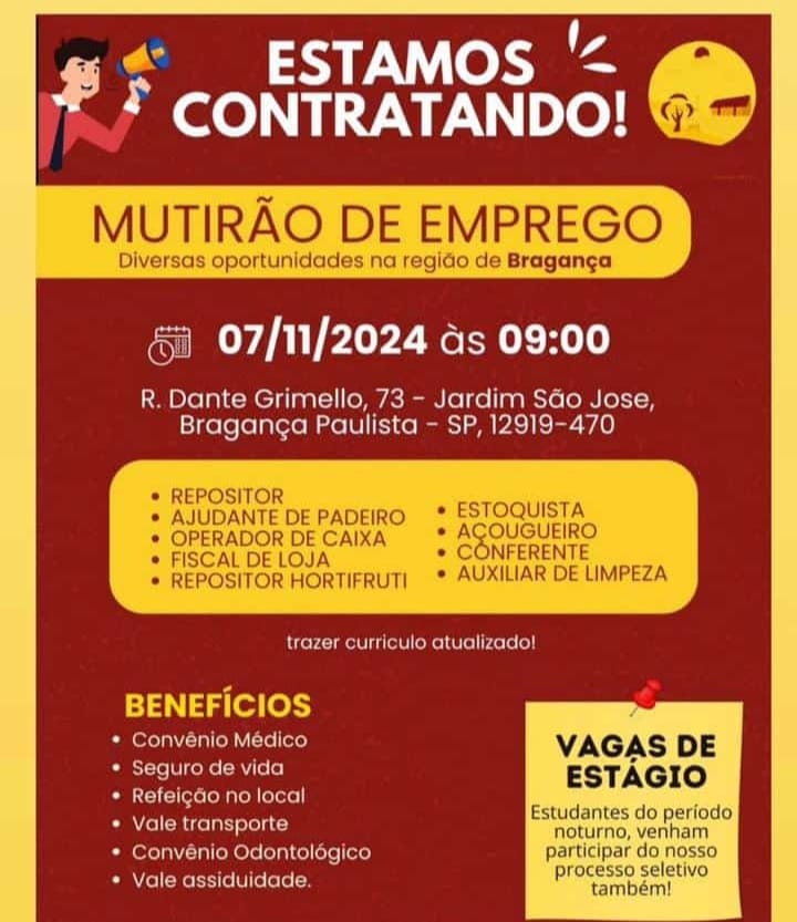 O Da Praça Supermercado, localizado na Rua Dante Grimello, 73, no Bairro Santa Luzia, realizará, na próxima quinta-feira, 7 de novembro, um grande mutirão de empregos para preencher diversas oportunidades de trabalho na região de Bragança Paulista. A sessão de entrevistas começa às 9h, e os candidatos deverão comparecer com currículo atualizado e documentos pessoais. […]