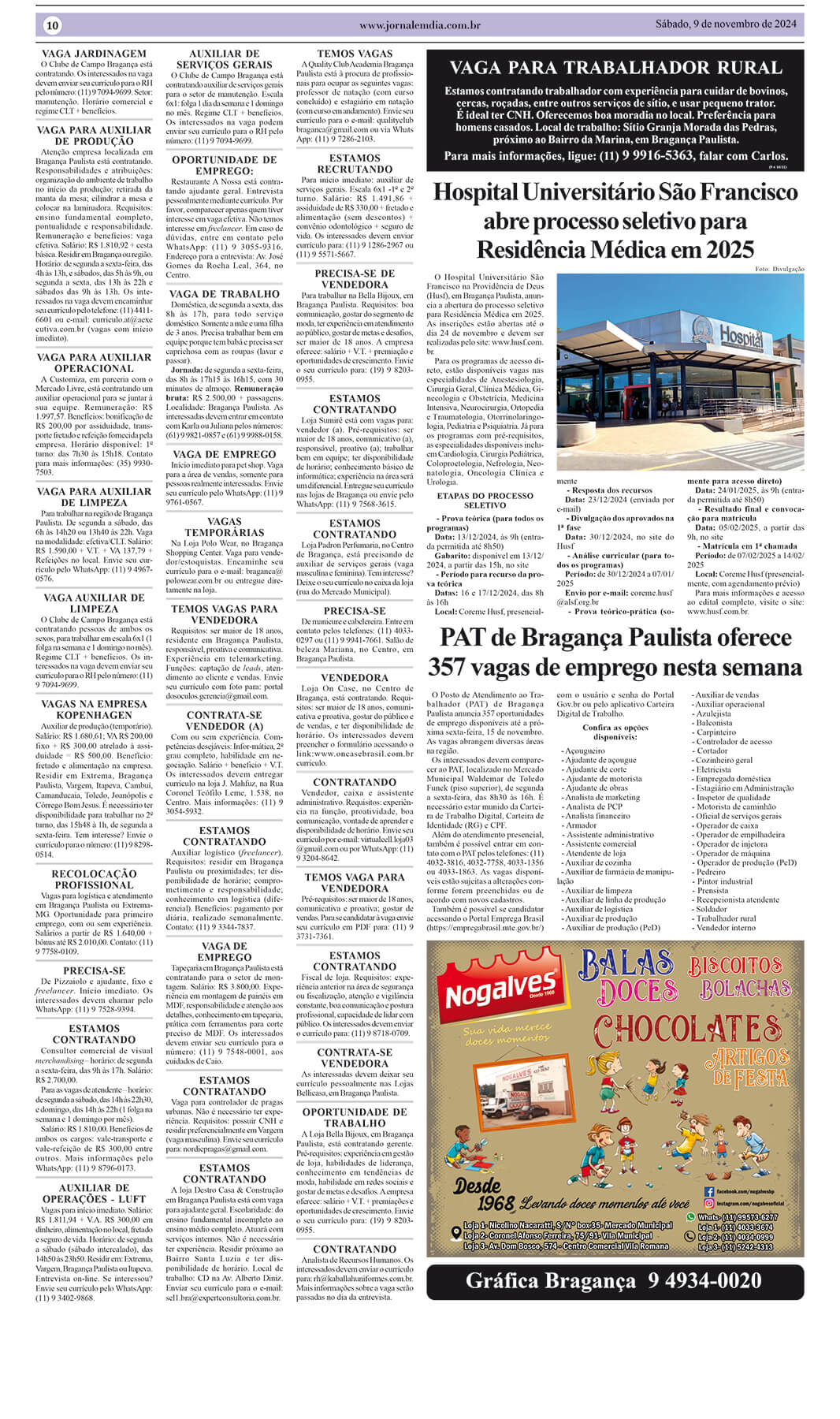 O Posto de Atendimento ao Trabalhador (PAT) de Bragança Paulista anuncia 357 oportunidades de emprego disponíveis entre os dias 6 e 15 de novembro. As vagas abrangem diversas áreas na região. O atendimento presencial do PAT, do Serviço Brasileiro de Apoio às Micro e Pequenas Empresas (SEBRAE) e do Banco do Povo ocorre no piso […]
