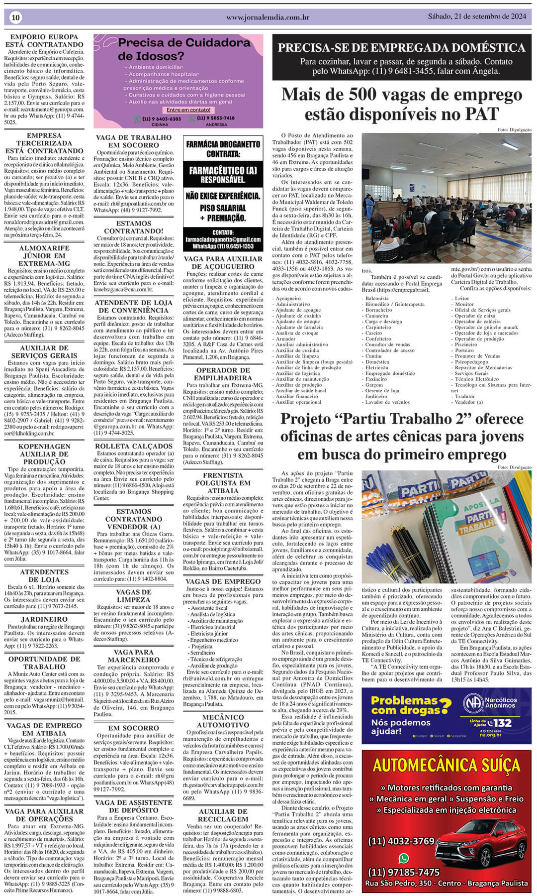 O PAT de Bragança Paulista está com 502 vagas disponíveis nesta semana, sendo 456 em Bragança Paulista e 46 em Extrema. O atendimento presencial acontece no Mercado Municipal Waldemar de Toledo Funck, onde o horário de funcionamento é de segunda a sexta, das 8h30 às 16h. Para se candidatar, é necessário ter em mãos a […]