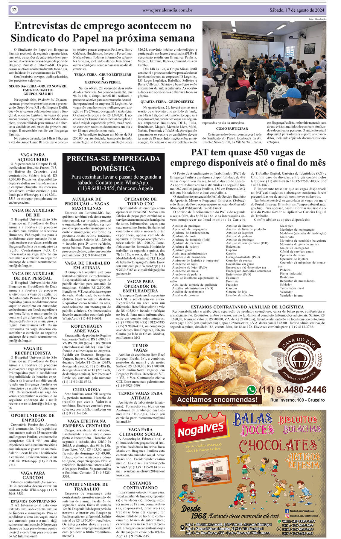 O Posto de Atendimento ao Trabalhador (PAT) de Bragança Paulista divulgou a disponibilidade de 448 vagas disponíveis na região até o dia 30 de agosto. As oportunidades estão distribuídas da seguinte forma: 287 em Bragança Paulista, 156 em Extrema-MG, três em Pinhalzinho e duas em Atibaia. O atendimento presencial do PAT, do Serviço Brasileiro de Apoio às Micro e Pequenas Empresas (Sebrae) e do Banco do Povo […]