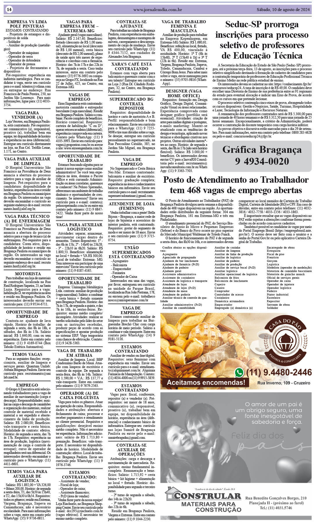 O Posto de Atendimento ao Trabalhador (PAT) de Bragança Paulista divulgou nesta semana a disponibilidade de 468 vagas disponíveis na região. As oportunidades estão distribuídas da seguinte forma: 304 em Bragança Paulista, 161 em Extrema-MG e três em Pinhalzinho. O atendimento presencial do PAT, do Serviço Brasileiro de Apoio às Micro e Pequenas Empresas (Sebrae) e do Banco do Povo ocorre no piso superior do Mercado Municipal […]