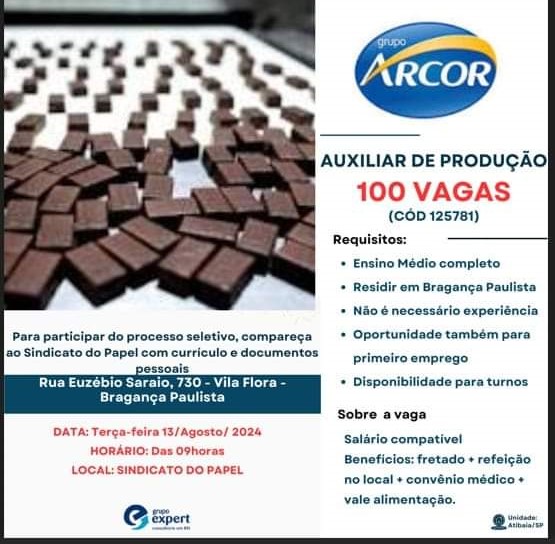 Nesta terça-feira, 13 de agosto, a partir das 9h, o Grupo Expert Consultoria em RH em parceria com o Sindicato do Papel de Bragança Paulista realizará em processo seletivo para preenchimento de 100 vagas de Auxiliar de Produção na Empresa Arcor. Requisitos: ensino médio completo, residir em Bragança Paulista, não é necessário experiência. Oportunidade também […]