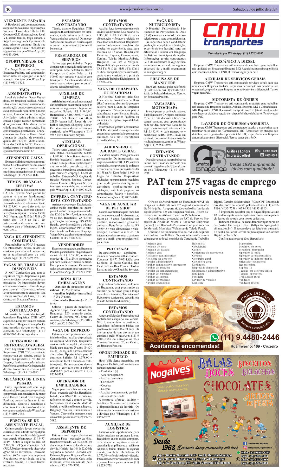 O Posto de Atendimento ao Trabalhador (PAT) de Bragança Paulista divulgou nesta semana a disponibilidade de 210 vagas de emprego na região. As oportunidades estão distribuídas da seguinte forma: 129 em Bragança Paulista, 53 em Extrema-MG, 8 em Atibaia, 10 em Itatiba e 10 em Jundiaí. Os interessados em se candidatar devem comparecer pessoalmente no […]
