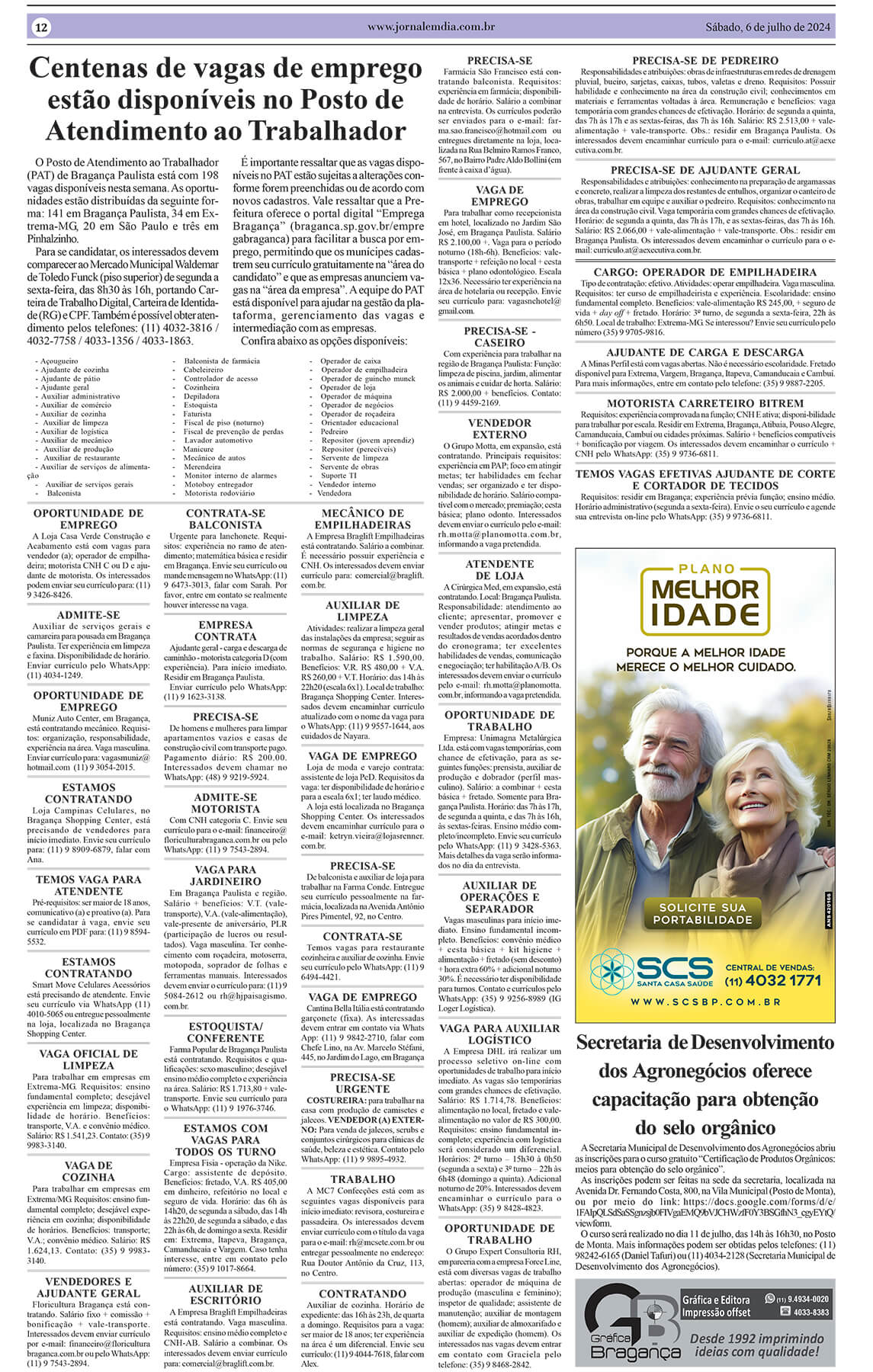 O Posto de Atendimento ao Trabalhador (PAT) de Bragança Paulista está com 198 vagas disponíveis nesta semana. As oportunidades estão distribuídas da seguinte forma: 141 vagas em Bragança Paulista, 34 em Extrema-MG, 20 em São Paulo e 3 em Pinhalzinho. Para se candidatar, os interessados devem comparecer ao Mercado Municipal Waldemar de Toledo Funck (piso […]