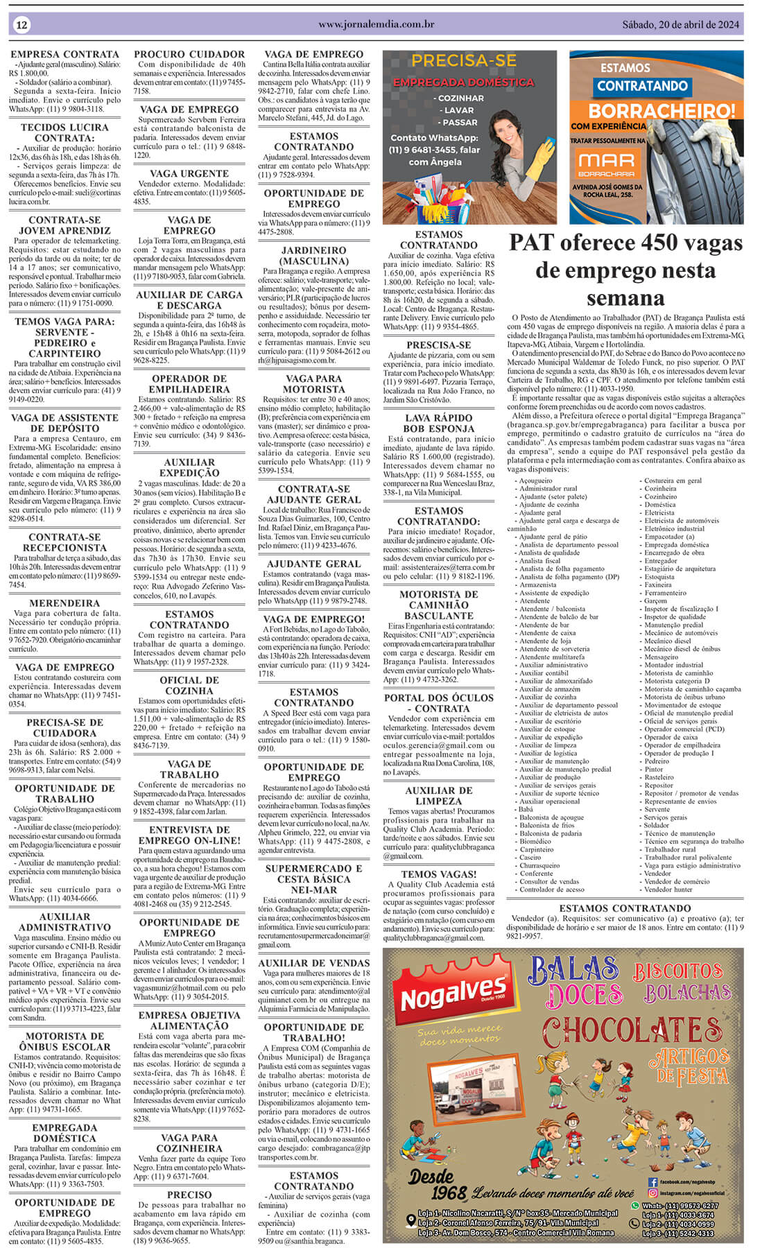 O Posto de Atendimento ao Trabalhador (PAT) de Bragança Paulista está com 450 vagas de emprego disponíveis na região, sendo a maioria delas em Bragança Paulista. As vagas também estão distribuídas em Extrema-MG, Itapeva-MG, Atibaia, Vargem e Hortolândia. O atendimento presencial do PAT, do SEBRAE e do Banco do Povo acontece no Mercado Municipal Waldemar […]