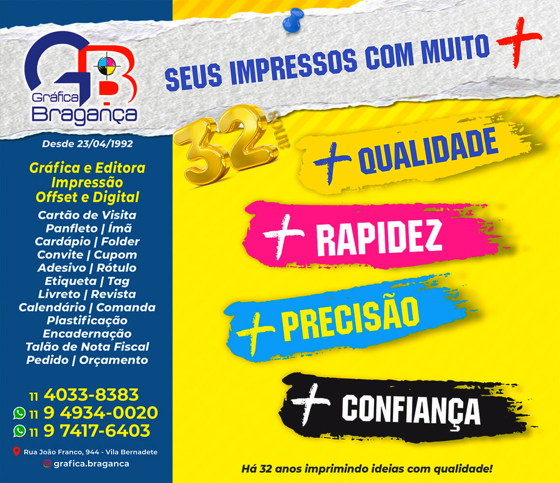 Nesta terça-feira, 23 de abril, a Gráfica Bragança completa 32 anos. Desde sua fundação em 1992, a empresa se destaca pela qualidade, compromisso e inovação no mercado gráfico local. Tudo começou em uma pequena área de menos de 30m2, situada no porão e nos fundos de uma casa na Rua Alceu Amoroso Lima, no Parque Brasil. […]
