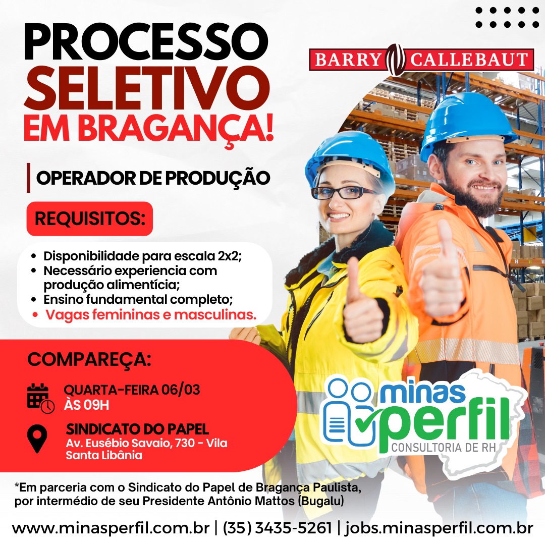 Nesta quarta-feira, dia 6 de março, o Sindicato do Papel de Bragança Paulista, sob a liderança do presidente Antônio Mattos (Bugalu), receberá, no período da manhã, às 9h, o Grupo Minas Perfil para a realização de seleção de entrevistas destinadas ao cargo de Operador de Produção. As vagas são para trabalhar na empresa de chocolate […]