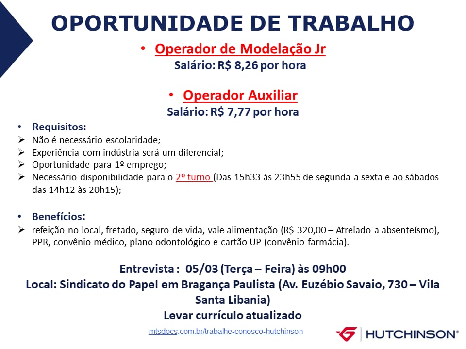 Nesta terça-feira, dia 5 de março, a partir das 9h, a Empresa HUTCHINSON, em parceria com o Sindicato do Papel de Bragança Paulista, por intermédio de seu presidente Antônio Mattos (Bugalu), estará realizando um processo seletivo para as seguintes vagas: Operador de Modelação Jr., com remuneração de R$ 8,26 por hora, e Operador Auxiliar, com […]