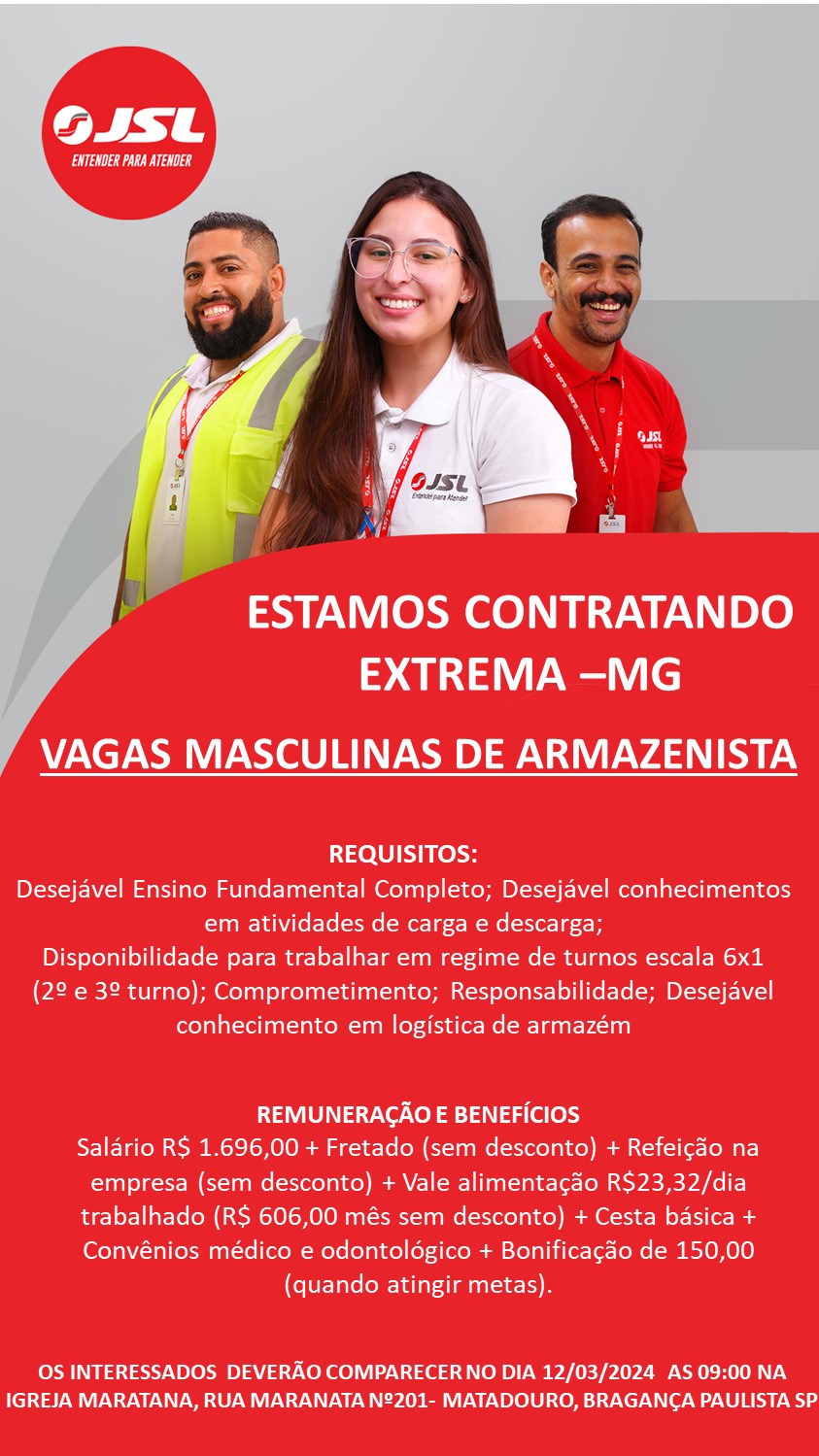 A JSL, empresa 100% brasileira com mais de 65 anos de atividades, está selecionando candidatos para a vaga de armazenista para trabalhar no Centro de Distribuição (CD) na cidade de Extrema-MG. Interessados devem comparecer na próxima terça-feira, dia 12 de março, às 9h, na Igreja Maranata, localizada na Rua Maranata, 201, Bairro Matadouro em Bragança Paulista […]