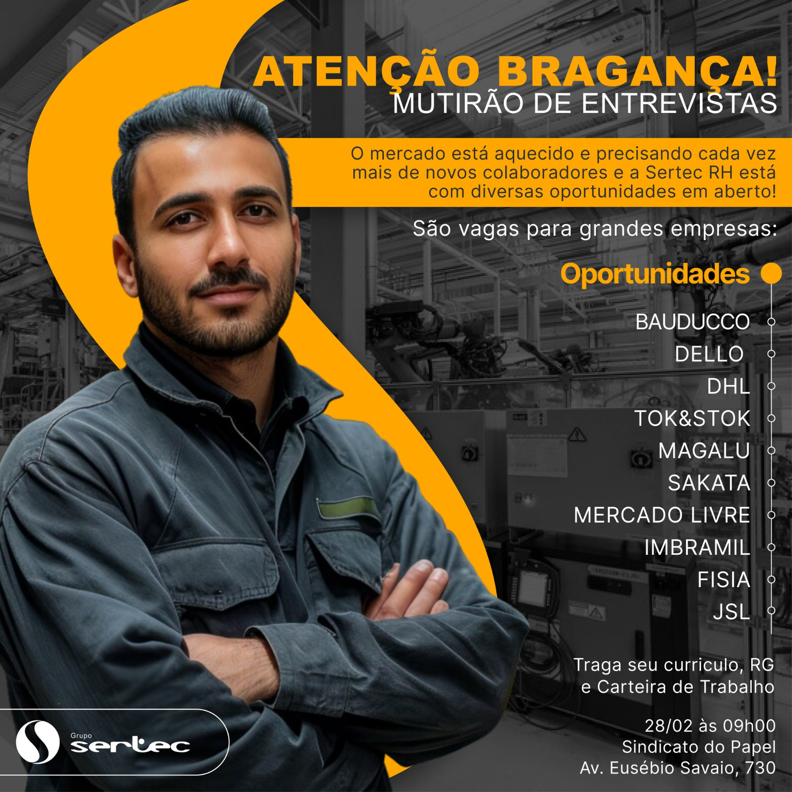 Nesta quarta-feira, dia 28 de fevereiro, a partir das 9h, o Grupo SERTEC, em parceria com o Sindicato do Papel de Bragança Paulista, liderado pelo presidente Antônio Mattos (Bugalu), realizará um processo seletivo para preenchimento de centenas de vagas de emprego, tanto para homens quanto para mulheres. Será um super mutirão, com a participação de […]