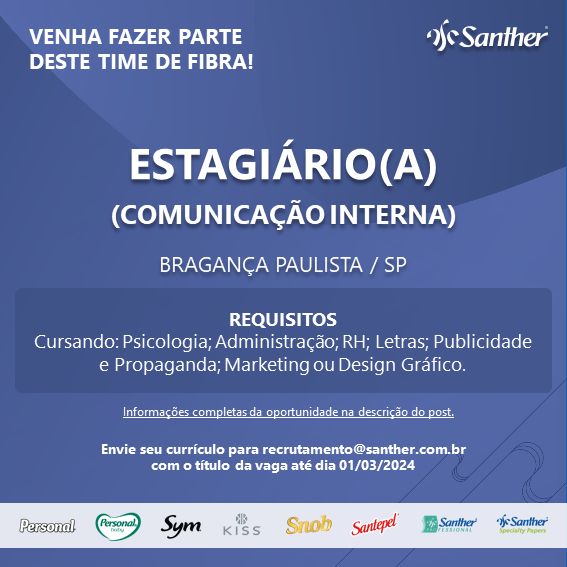 A Santher, líder na produção de bens de consumo, está buscando Estagiário(a) jovem profissional interessado(a) em ingressar no mercado de trabalho e aprender com a empresa. A vaga é para atuar na área de Comunicação Interna. É importante ressaltar que os candidatos precisam estar cursando: Psicologia, Administração, RH, Letras, Marketing, Design Gráfico ou áreas correlatas. […]
