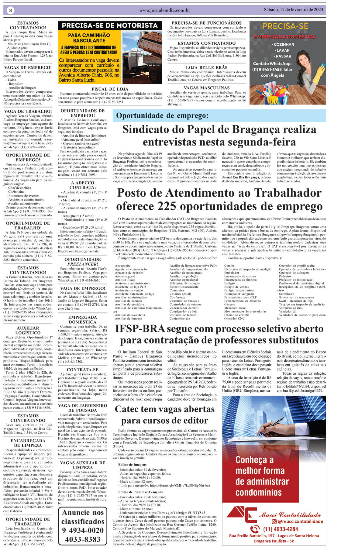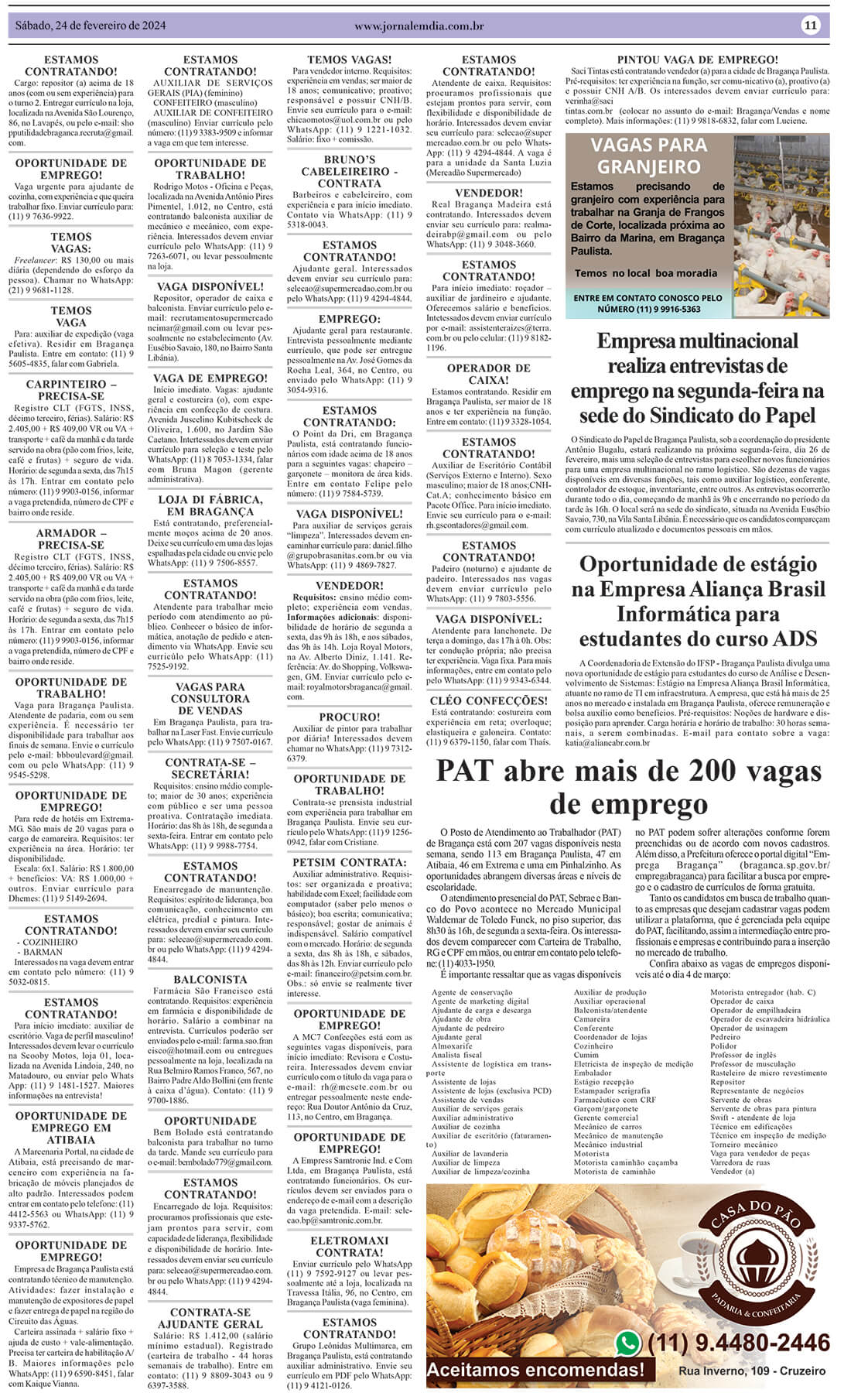 O Posto de Atendimento ao Trabalhador (PAT) de Bragança está com 207 vagas disponíveis nesta semana, sendo 113 em Bragança Paulista, 47 em Atibaia, 46 em Extrema e uma em Pinhalzinho. As oportunidades abrangem diversas áreas e níveis de escolaridade. O atendimento presencial do PAT, SEBRAE e Banco do Povo acontece no Mercado Municipal Waldemar […]