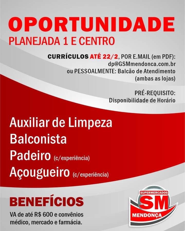 Supermercados Mendonça está contratando novos funcionários para as duas lojas, na Planejada 1 e no Centro. Os candidatos às vagas devem enviar seus currículos, em PDF por e-mail para dp@gsmmendonca.com.br ou entregá-los pessoalmente nos balcões de atendimento das lojas da Planejada 1, na Av. Dep. Virgílio de Carvalho Pinto, 601, ou na unidade do centro, […]