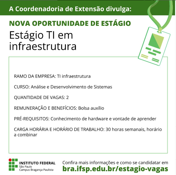 A Coordenadoria de Extensão do IFSP – Bragança Paulista divulga uma nova oportunidade de estágio para estudantes do curso de Análise e Desenvolvimento de Sistemas: Estágio na Empresa Aliança Brasil Informática, atuante no ramo de TI em infraestrutura. A empresa, que está há mais de 25 anos no mercado e está instalada em Bragança Paulista, […]