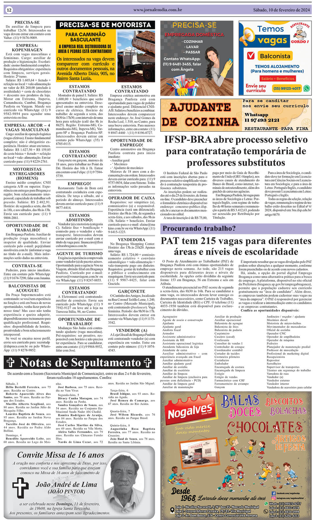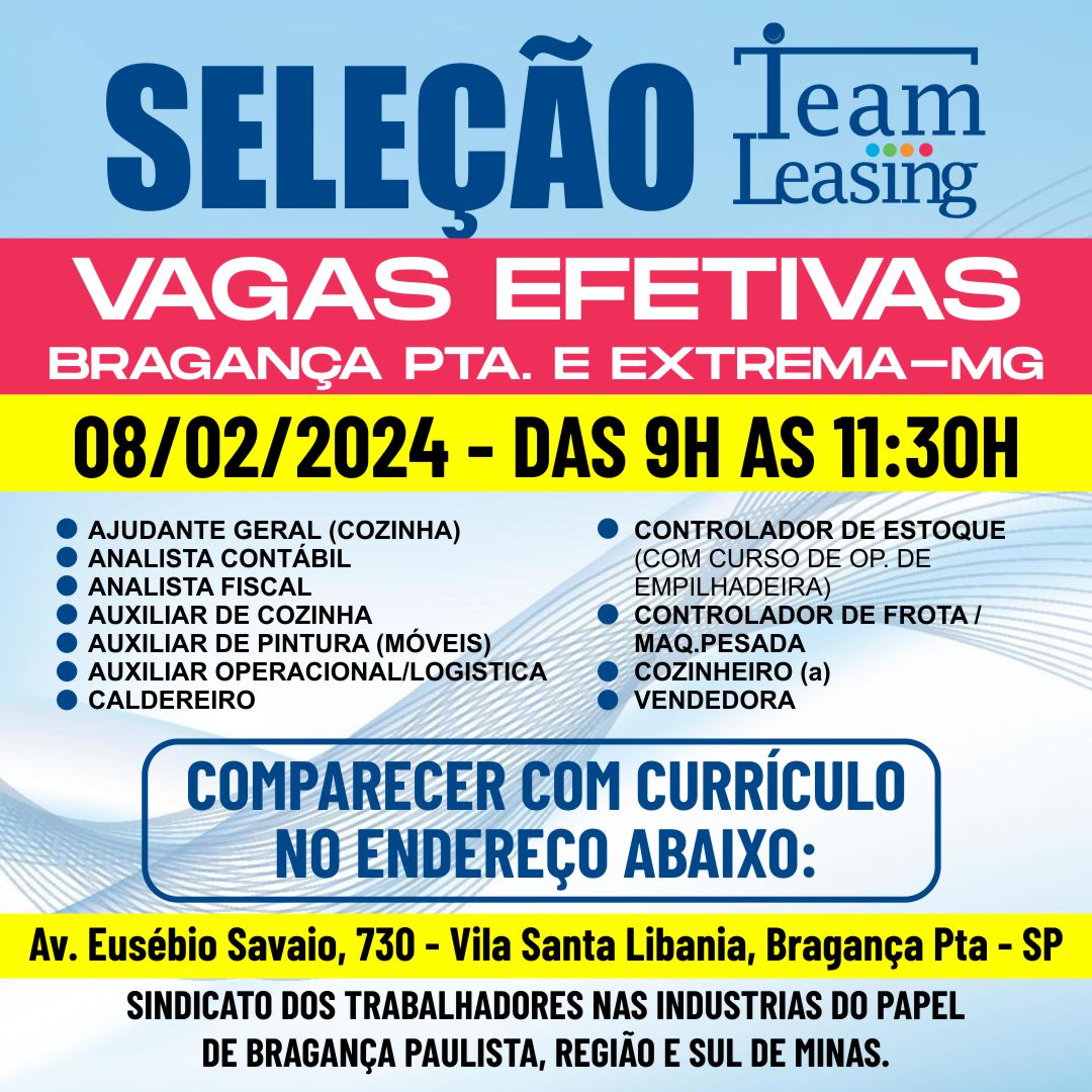 Nesta quinta-feira, 8 de fevereiro, o Sindicato do Papel de Bragança Paulista, sob a coordenação do presidente Antônio Bugalu, em parceria com a Agência Team Leasing, estará realizando entrevistas para o preenchimento de dezenas de vagas de emprego efetivas em diversas funções, tais como: Ajudante Geral (Cozinha), Analista Contábil, Analista Fiscal, Auxiliar de Cozinha, Auxiliar […]