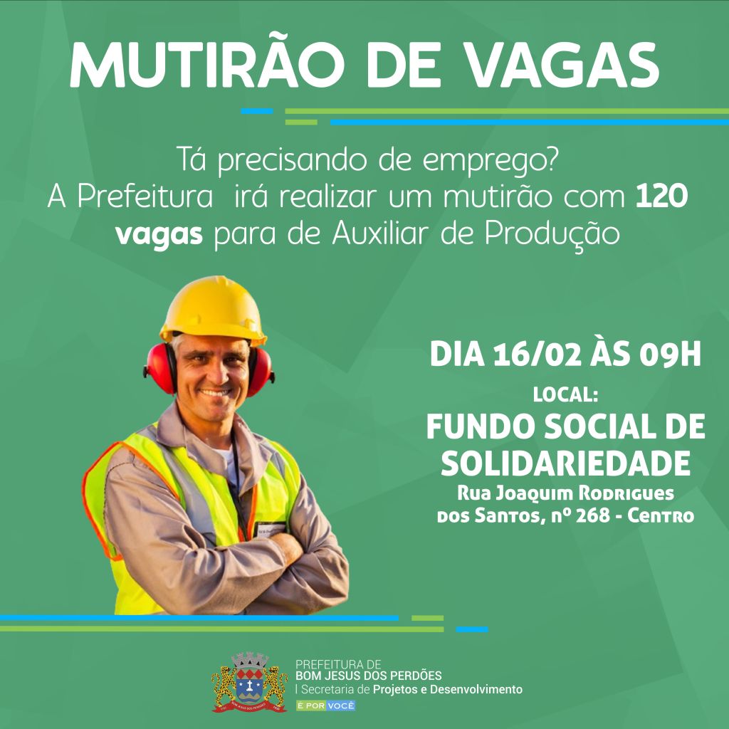 A Prefeitura de Bom Jesus dos Perdões realizará, na próxima sexta-feira, dia 16 de fevereiro, a partir das 9h, um mutirão de vagas de emprego para Auxiliar de Produção, em parceria com o Fundo Social de Solidariedade. Serão disponibilizadas 120 vagas para esse cargo e, para se candidatar, é necessário trazer um currículo atualizado juntamente […]