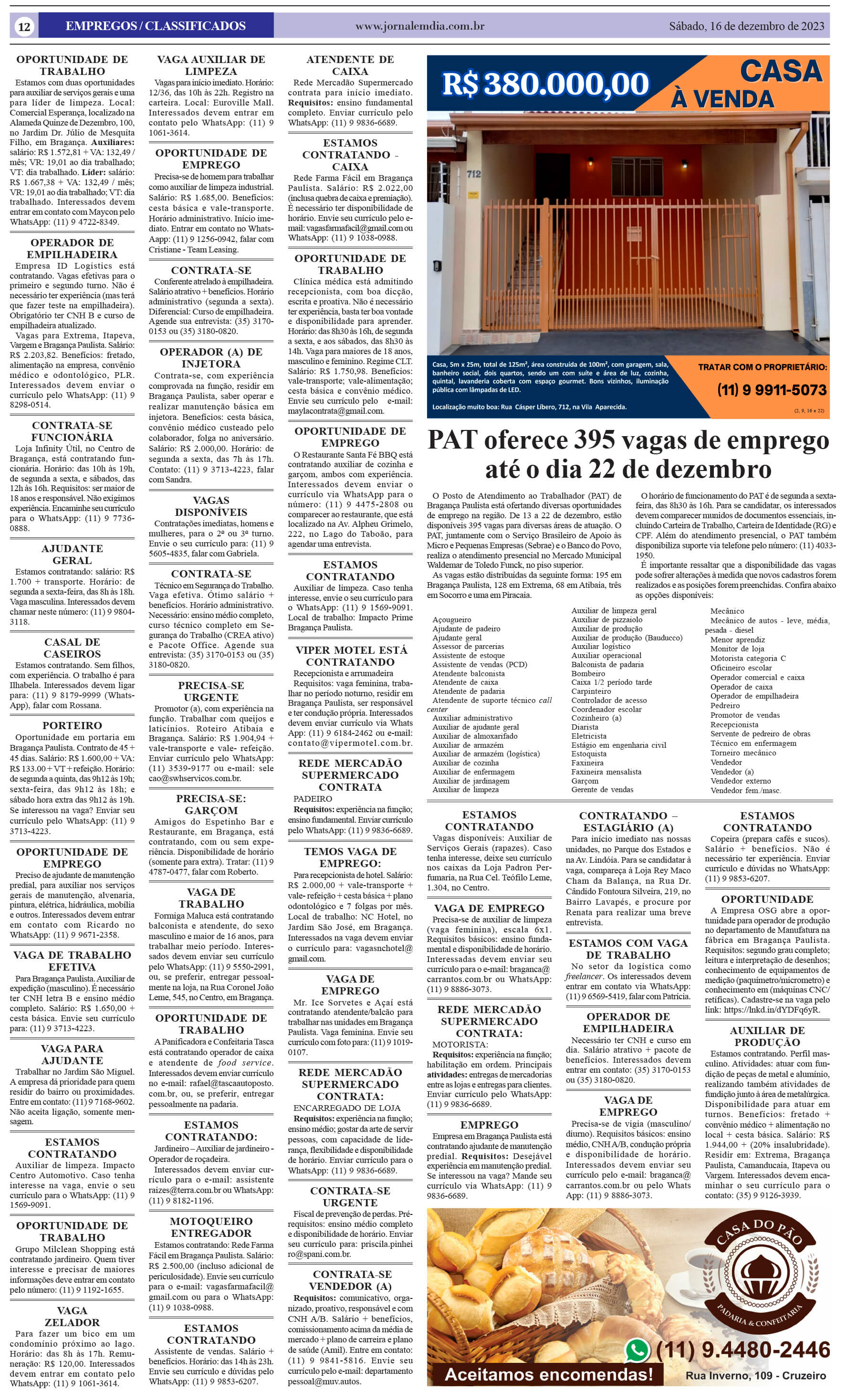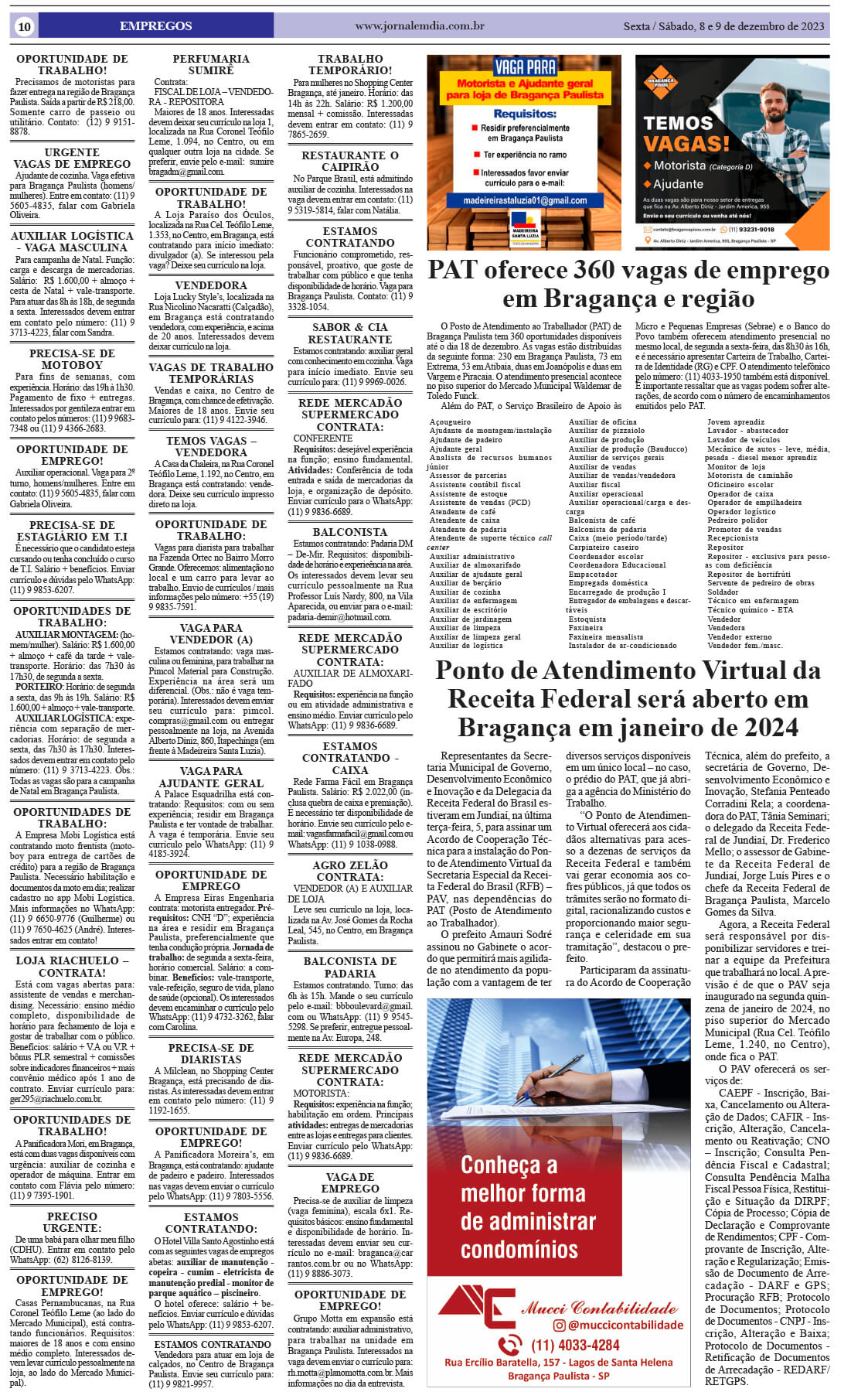 O Posto de Atendimento ao Trabalhador (PAT) de Bragança Paulista está ofertando diversas oportunidades de emprego na região. De 13 a 22 de dezembro, estão disponíveis 395 vagas para diversas áreas de atuação. O PAT, juntamente com o Serviço Brasileiro de Apoio às Micro e Pequenas Empresas (Sebrae) e o Banco do Povo, realiza o […]