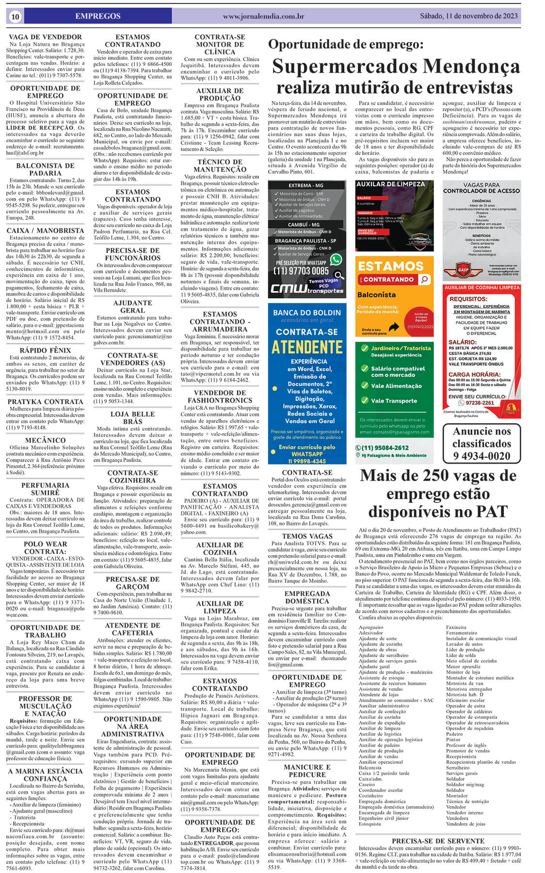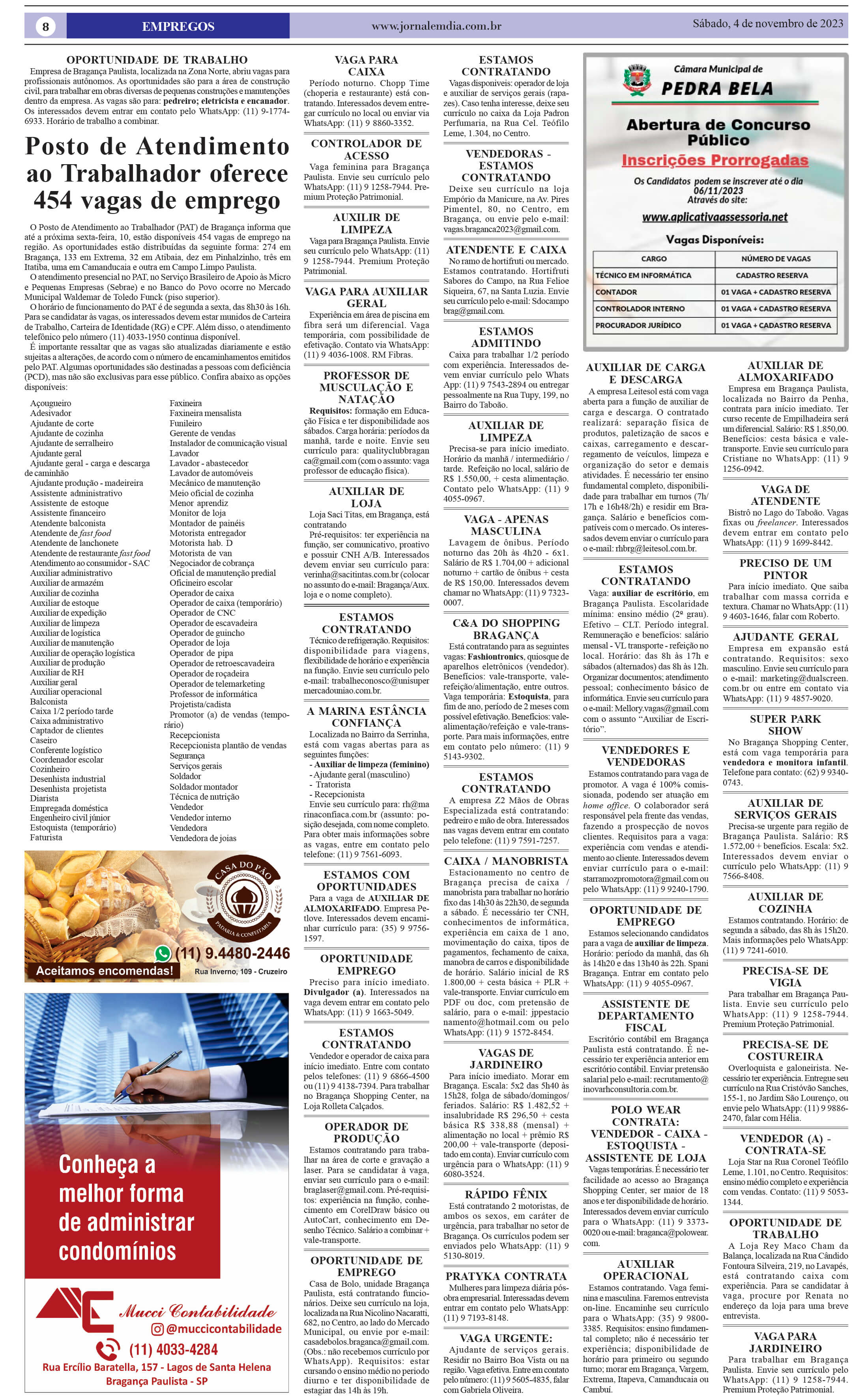Durante o período de 08 a 20 de novembro, o Posto de Atendimento ao Trabalhador (PAT) de Bragança informa que está oferecendo 276 vagas de emprego na região. Essas oportunidades estão distribuídas da seguinte forma: 181 vagas em Bragança Paulista, 69 em Extrema-MG, 20 em Atibaia, 3 em Itatiba, 1 em Campo Limpo Paulista, 1 […]