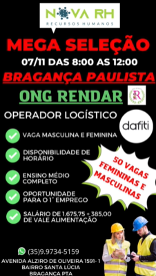 Nesta terça-feira, 7, das 8h às 12h, a Nova RH (Recursos Humanos) realizará uma Mega Seleção na sede da ONG Projeto Rendar de Bragança Paulista. O objetivo é contratar novos funcionários para a função de Operador Logística na empresa Dafiti. São 50 vagas disponíveis para ambos os sexos e os candidatos devem ter disponibilidade de horário […]