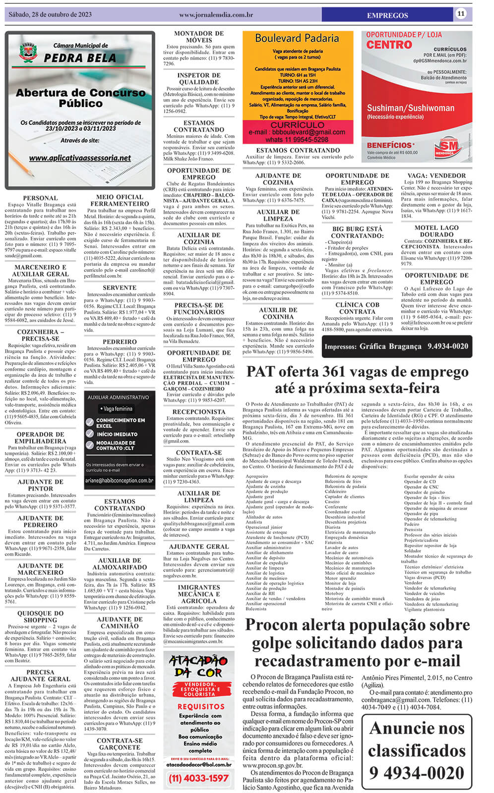 O Posto de Atendimento ao Trabalhador (PAT) de Bragança está informando que durante a semana de 1 a 10 de novembro, estão disponíveis 454 vagas de emprego na região. Essas vagas estão distribuídas da seguinte forma: 274 em Bragança, 133 em Extrema, 32 em Atibaia, 10 em Pinhalzinho, 3 em Itatiba; além de uma vaga […]