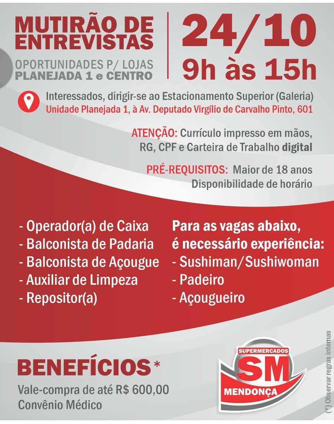 Na próxima terça-feira, 24, o Supermercados Mendonça realizará um mutirão de entrevistas das 9h às 15h para contratar novos funcionários para suas duas lojas, localizadas na Planejada 1 e no Centro. Local das entrevistas: Estacionamento superior (galeria) da unidade 1 na Planejada Endereço: Avenida Virgílio de Carvalho Pintos, 601. Para se candidatar, é necessário comparecer […]