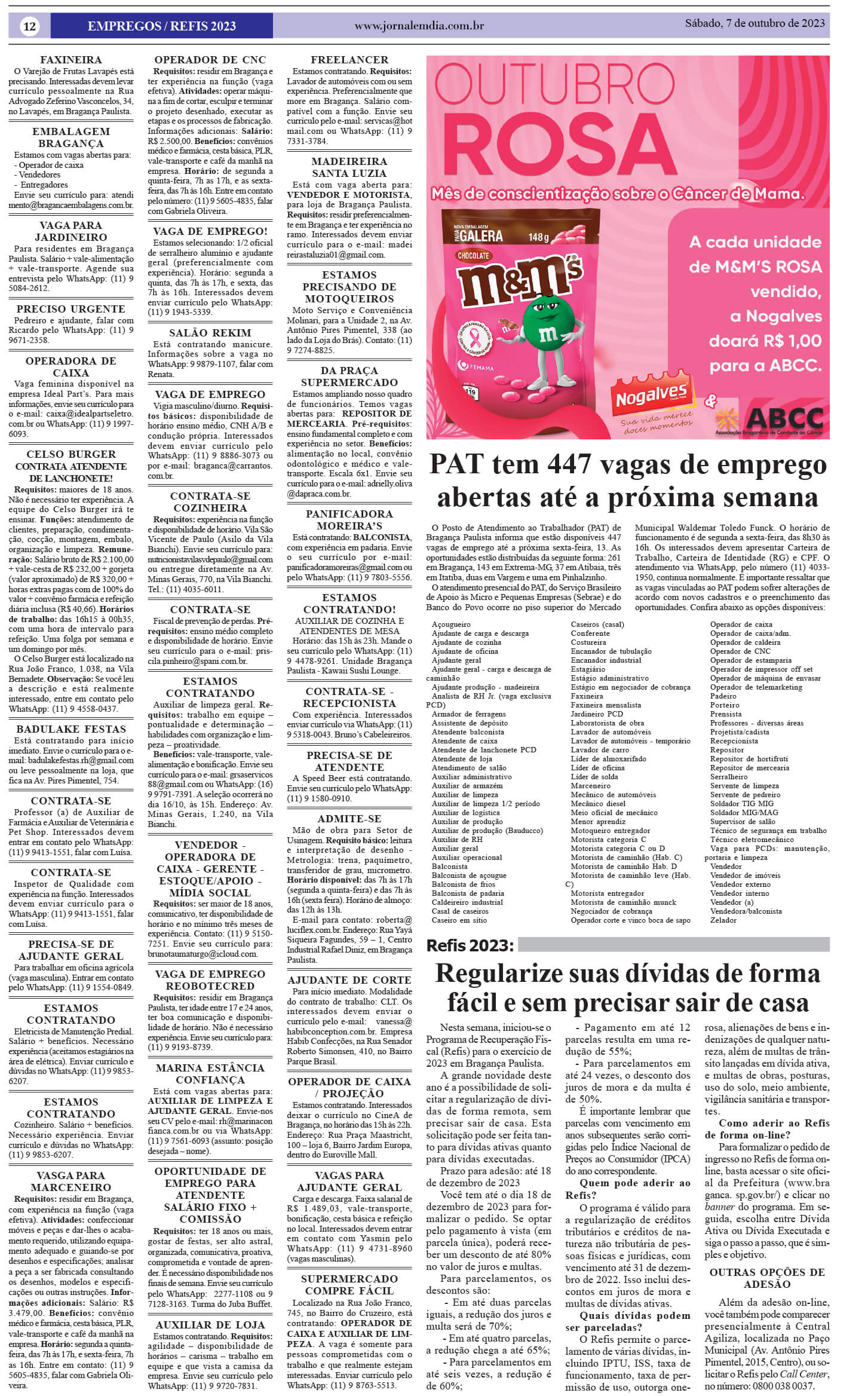 O Posto de Atendimento ao Trabalhador (PAT) de Bragança Paulista informa que estão disponíveis 447 vagas de emprego até o próximo dia 13 (sexta-feira). Dessas vagas, 261 estão em Bragança, 143 em Extrema-MG, 37 em Atibaia, 3 em Itatiba, 2 em Vargem e 1 em Pinhalzinho. O atendimento presencial do PAT, do Serviço Brasileiro de […]