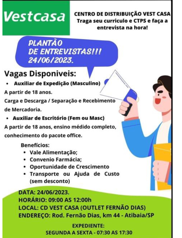 O Centro de Abastecimento Vest Casa, localizado na rodovia Fernão Dias km 44, em Atibaia, está com vagas abertas para duas funções distintas, oferecendo oportunidades de emprego na região. As vagas são para Auxiliar de Expedição e Auxiliar de Escritório, sendo necessária a presença de candidatos do sexo masculino para a primeira função, enquanto a […]