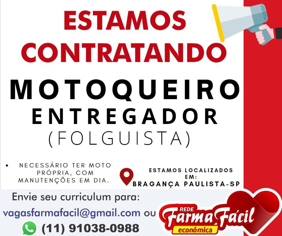 A Rede Farma Fácil em Bragança Paulista está oferecendo oportunidades de emprego para aqueles que desejam fazer parte do seu time de sucesso. Se você busca uma colocação no mercado de trabalho essa pode ser sua chance. Confira as vagas disponíveis: MOTOBOY ENTREGADOR FOLGUISTA: É necessário ter um bom conhecimento das rotas da cidade e […]