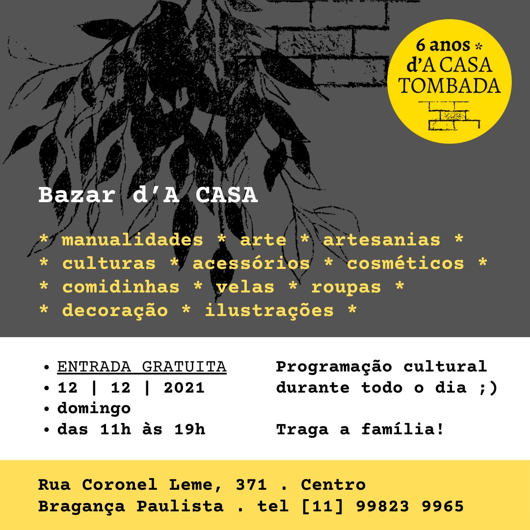 Ao menos três espaços culturais da cidade irão promover bazares às vésperas do Natal: A Casa Tombada, o Índigo Arte e a Garaginha do Edith, todos com entrada gratuita. Com tradição de acontecer no mês de dezembro, época de dar, doar, trocar presentes e receber, o Bazar d’A Casa Tombada acontece no domingo, 12, das […]