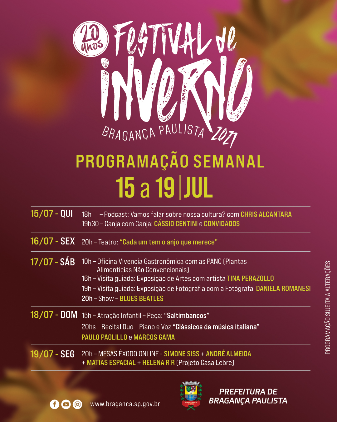 A Secretaria de Cultura e Turismo, disponibiliza os formulários de inscrição para a terceira semana de atividades do “Festival de Inverno 2021”. De quinta-feira a domingo, o público poderá prestigiar uma série de atividades culturais: shows musicais, recitais, espetáculos teatrais para crianças, jovens e adultos. As apresentações contam com tradução e interpretação em libras. da […]